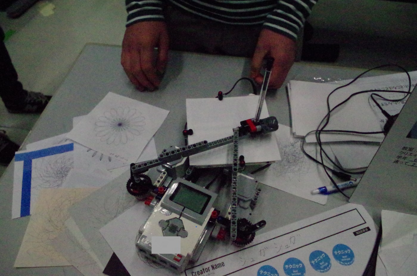 クリエイターネーム「シュガシュガ」くん制作の「スピログラフ」。絵を描くロボットを作ってみたかったそうで、数値を変えるといろんな模様が表れる様子は、いつまで見ていても飽きません。左右の腕それぞれに数値を変えることができ、どんな模様が表れるのかワクワクします。