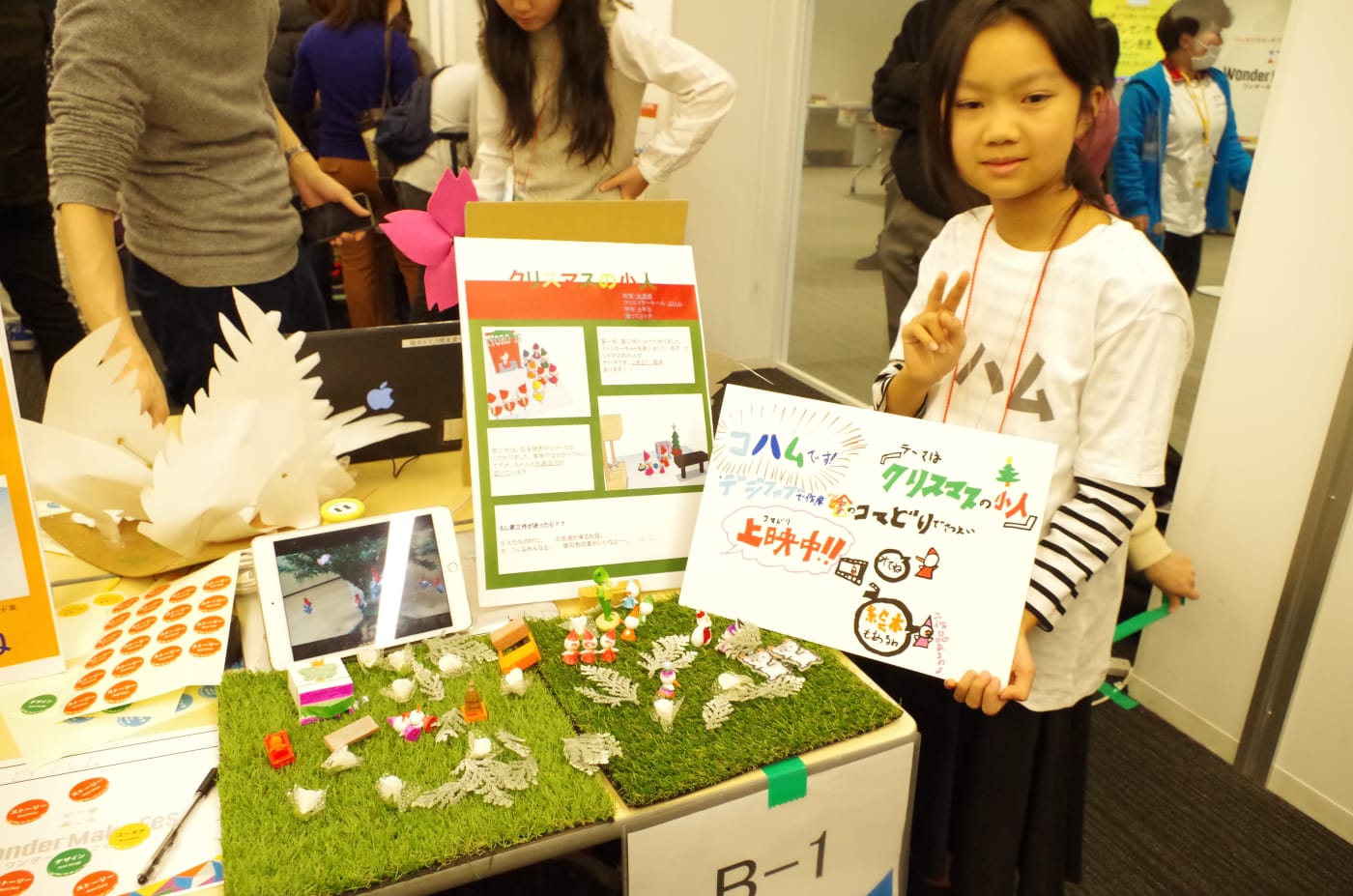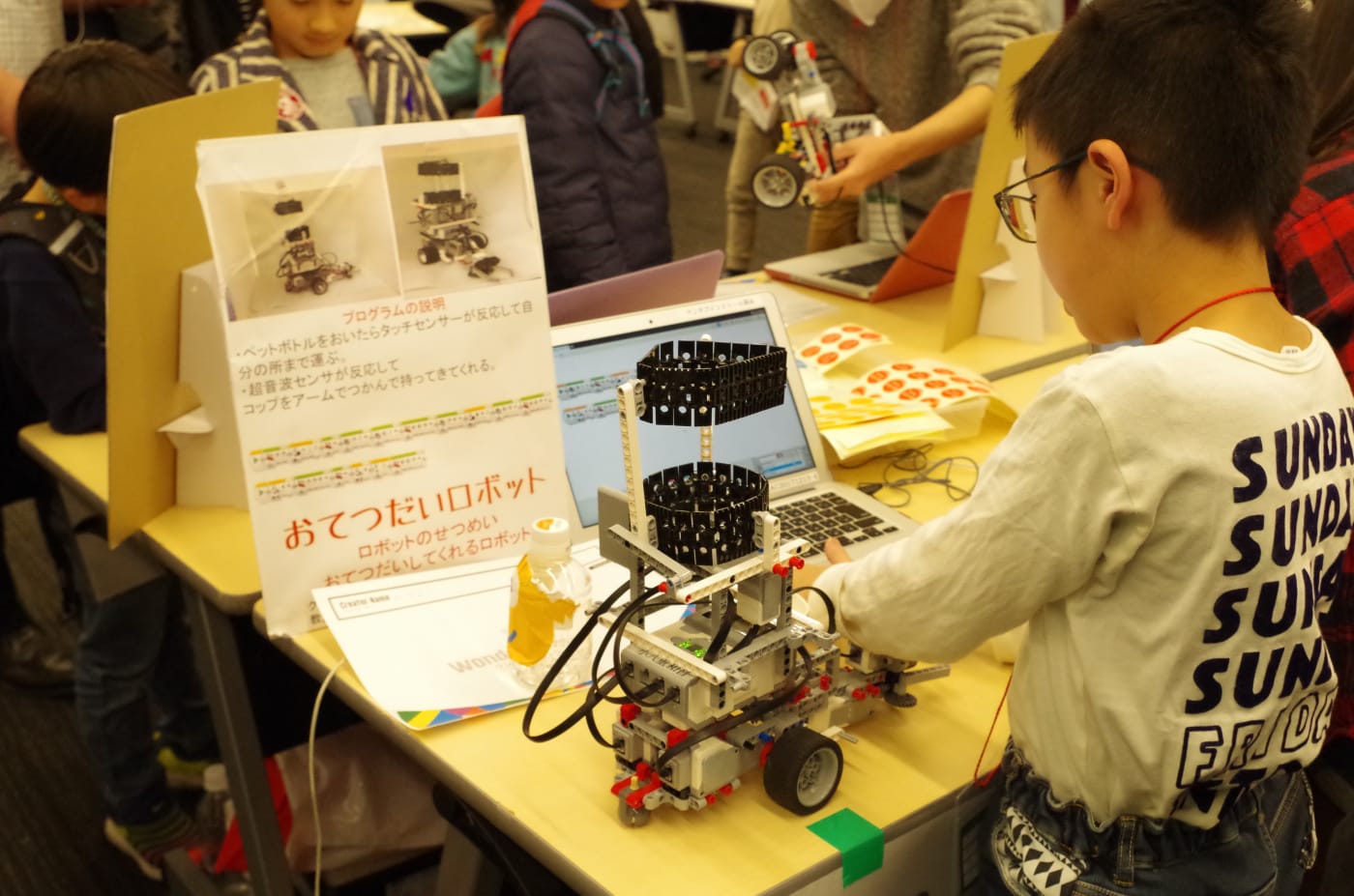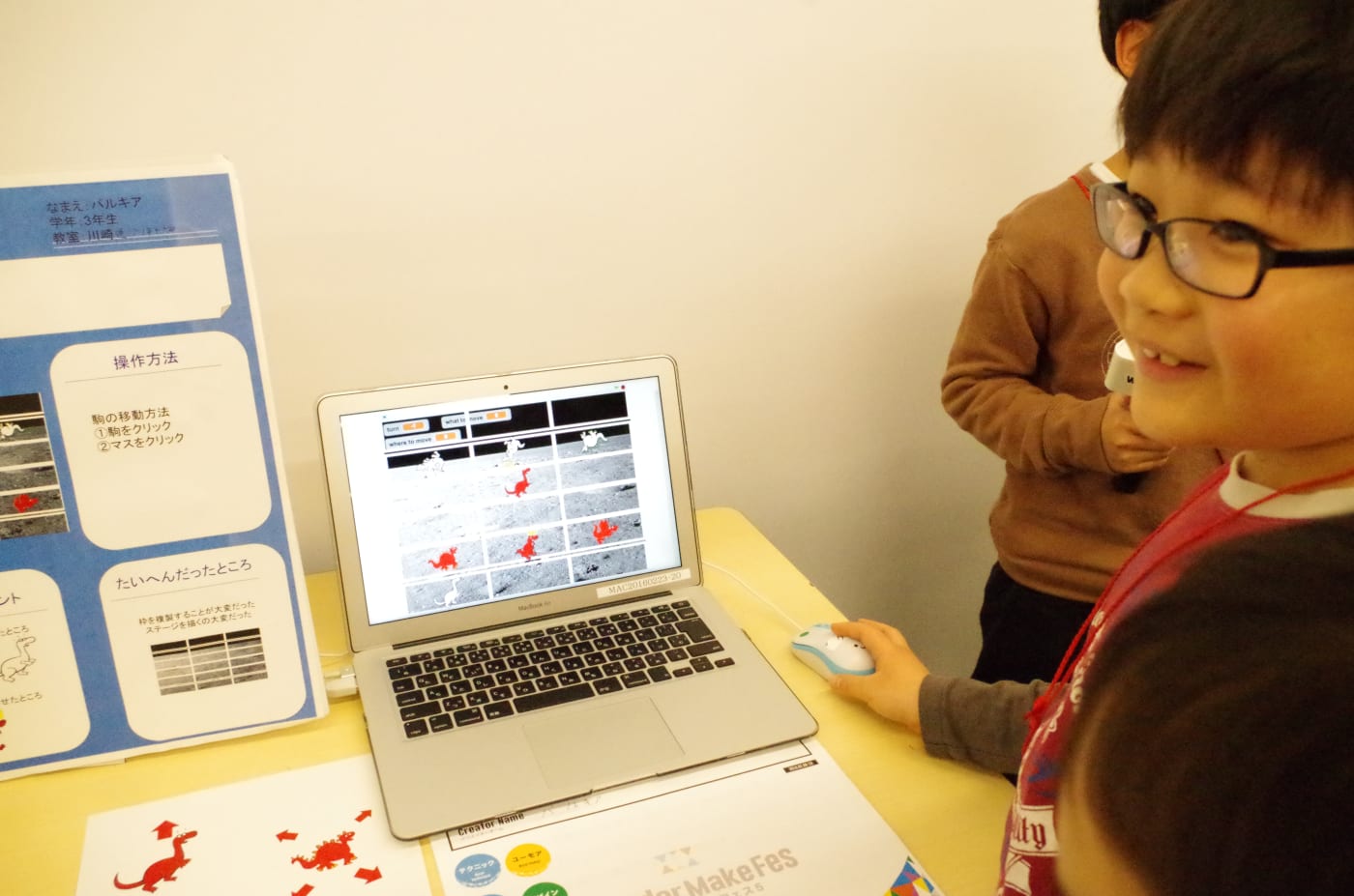 睦くん:たくさんの子どもたちが見に来てくれましたが、たいへんでした(笑)! 発表開始時間の前から集まってくれたのですが、小さい子の中には作品で遊びだす子もいて、制止するのに苦労しました(笑)。昨日はちょっと緊張して寝られなかったんですが、こうやってたくさん反響があると、がんばって作ってよかったと思いますね。
