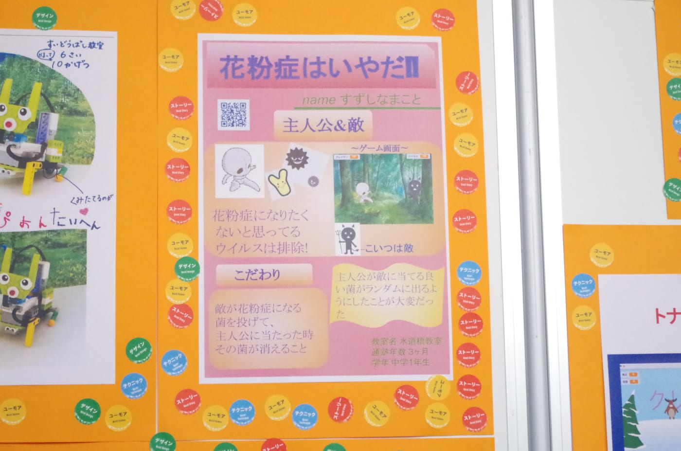 「花粉症はいやだ!」というゲームのポスター発表。たくさんのフィードバックシールをもらっていました。「ナイスユーモア」のシールがたくさんありました。