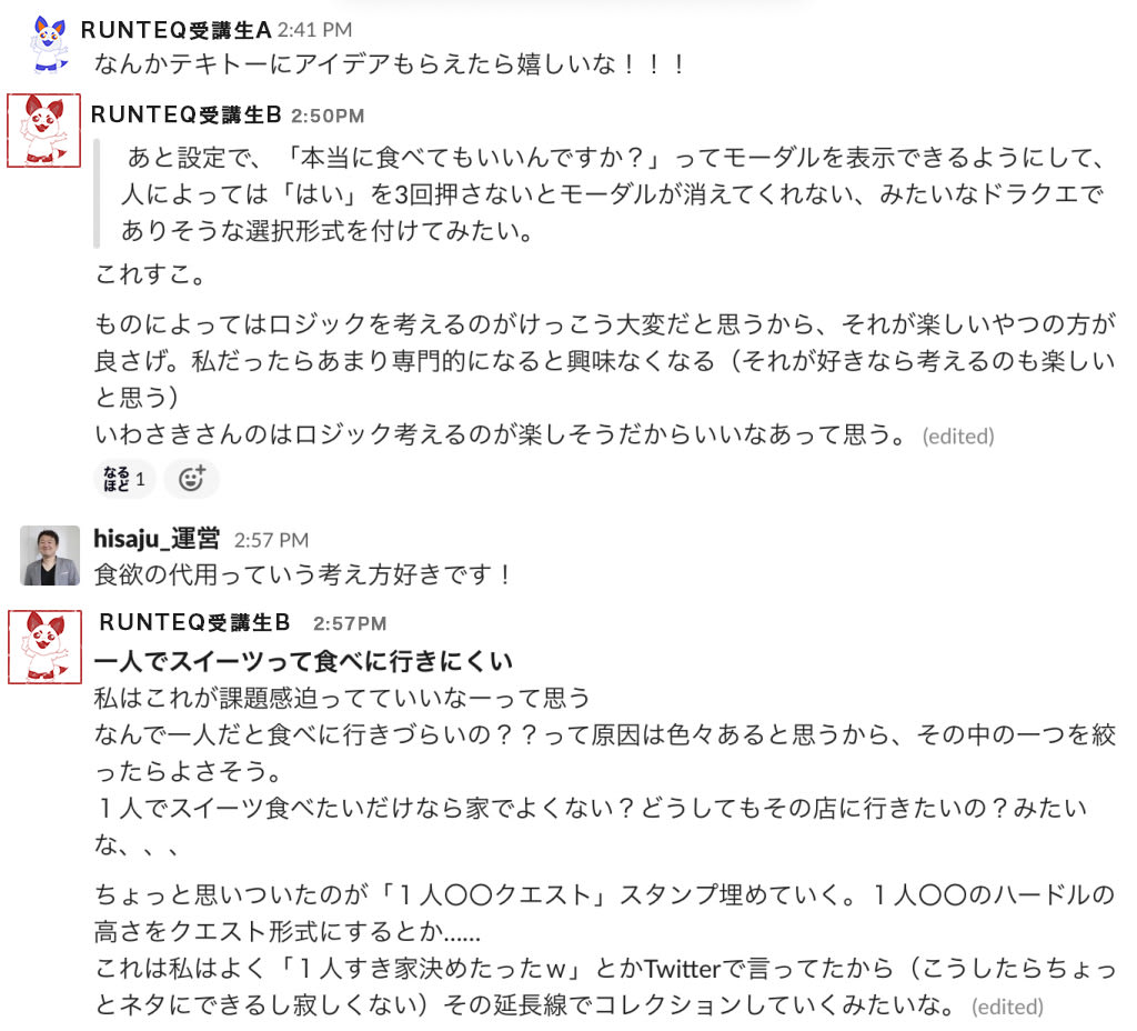 RUNTEQ(ランテック)のSlackグループのようす。ラフな相談もできるので安心感がある