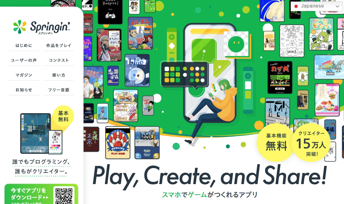 スマートフォンで簡単なゲームや絵本が制作できるのは、Springin’(スプリンギン)です。作品を共有することで、企業や他のユーザーに作品を見てもらうことが可能です。コーディングは不要であるため、未就学児でも取り組みやすいことが特徴。