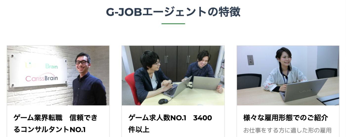G-JOBエージェントはゲーム業界に特化した転職エージェントです。ゲーム業界に精通したキャリアアドバイザーが転職をサポートしてくれるので、専門的な話もしやすく、案件のミスマッチが少ないのが特徴です。