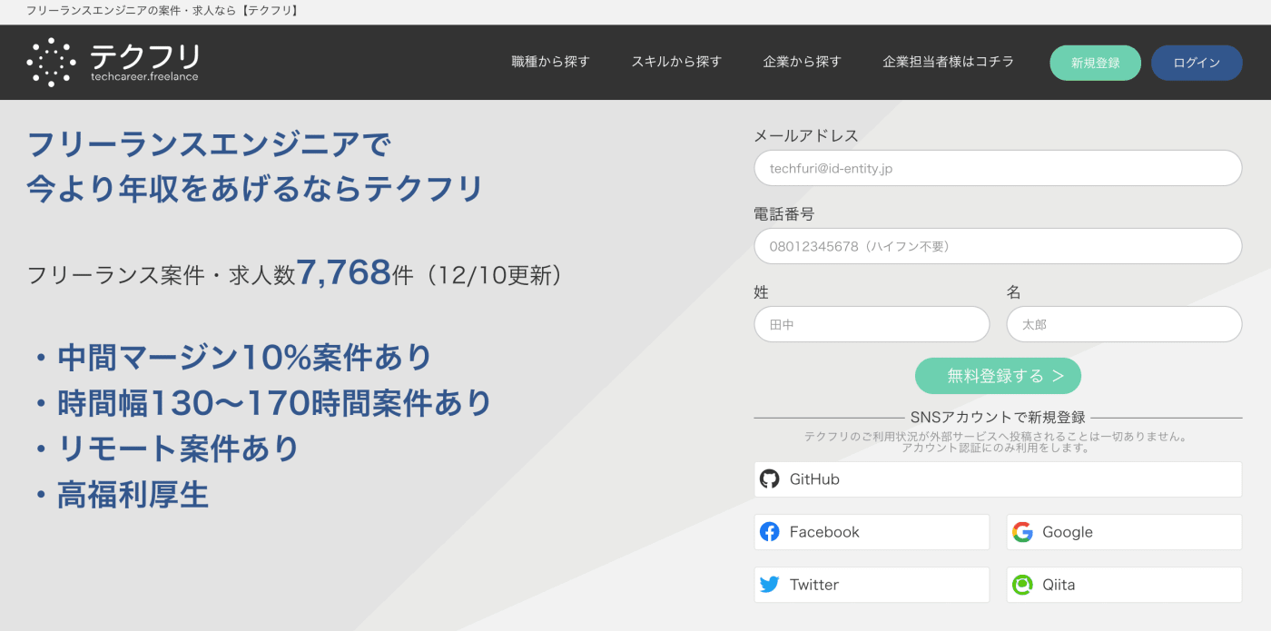 テクフリはエンジニア・クリエイターの方へ向けた案件情報を提供するフリーランスエージェントです。