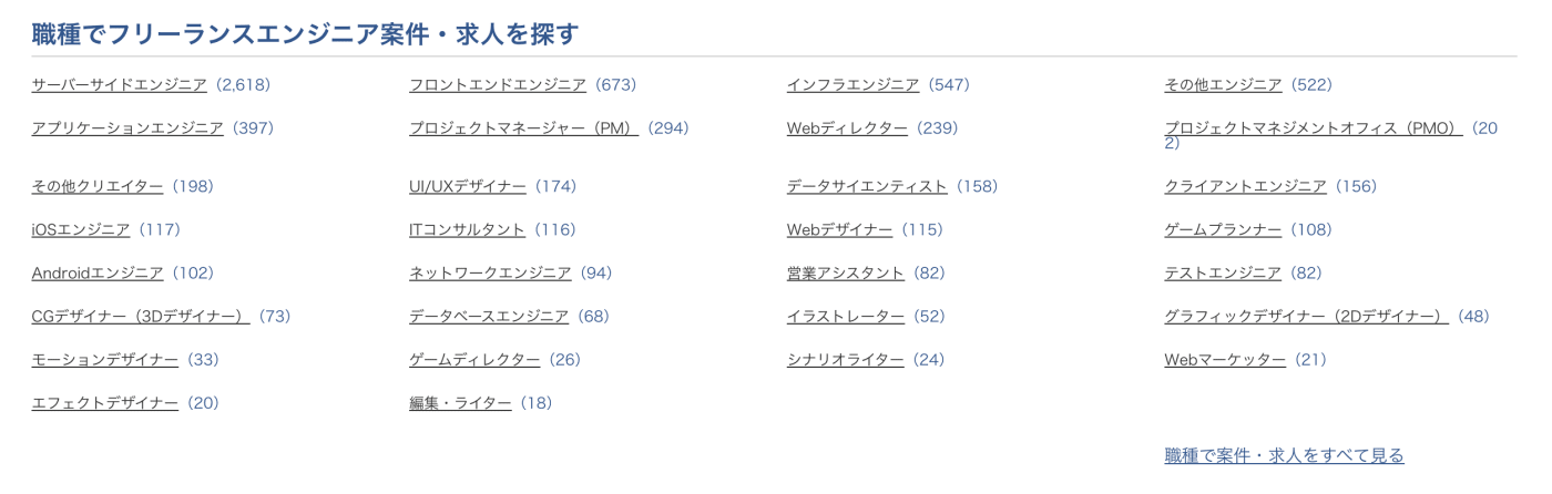 テクフリの職種別案件・求人(2021年12月取材時点)
