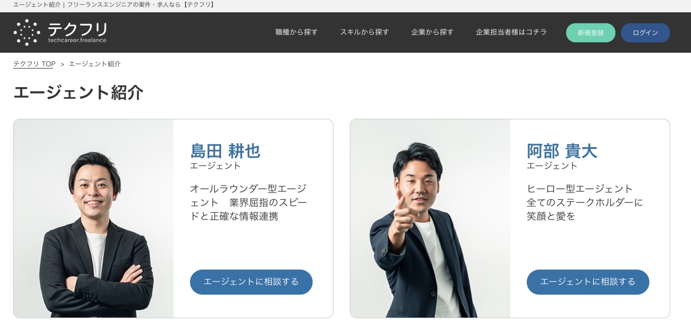 テクフリ公式サイトにはエージェントの顔写真とプロフィールが掲載されている