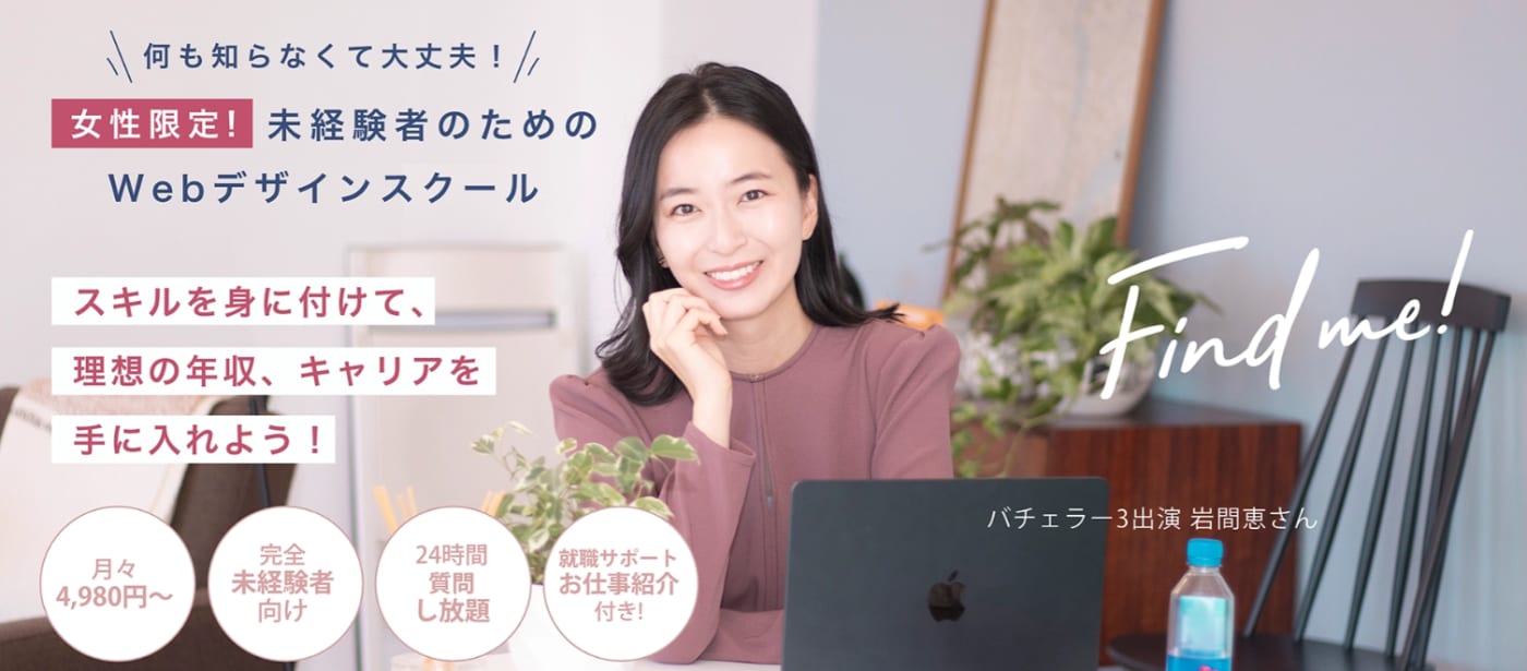 ファインドミーは、女性限定、未経験者のためのWebデザインスクールです。月額4,980円のサブスクリプション型で、Webデザイン、Webサイト制作、Webマーケティングに関する基礎から応用までの幅広い内容を学ぶことができます。