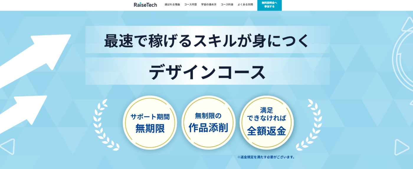 | 返金保証 | サービス提供開始より8日以内に申請を行うことで受講キャンセル可能 |