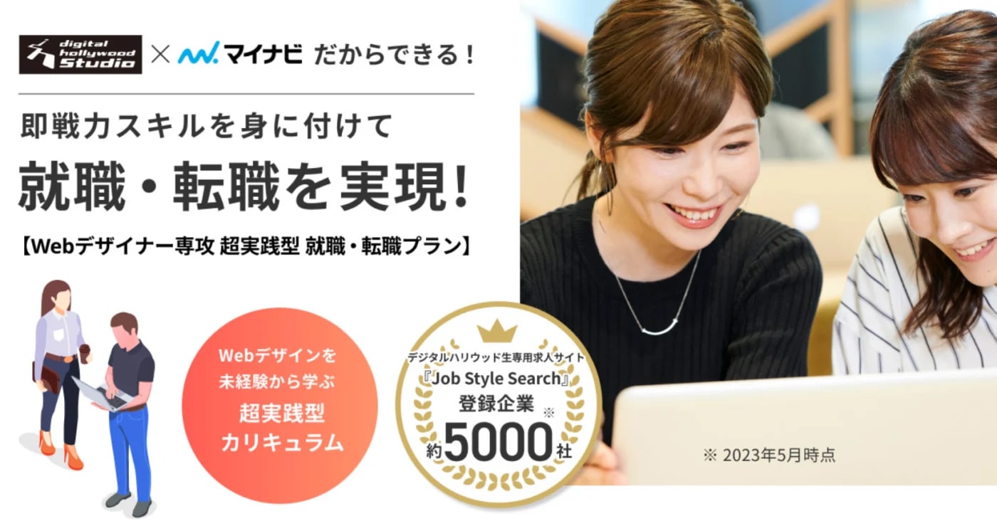 デジタルハリウッドSTUDIO|Webデザイナー専攻 超実践型就職・転職プランは、デジタルハリウッドSTUDIOとクリエイティブ職種専門の転職エージェント『マイナビクリエイター』を運営する株式会社マイナビワークスがコラボする、未経験・異業種からWebデザイナーを目指す人に向けたWebデザインスクールです。
