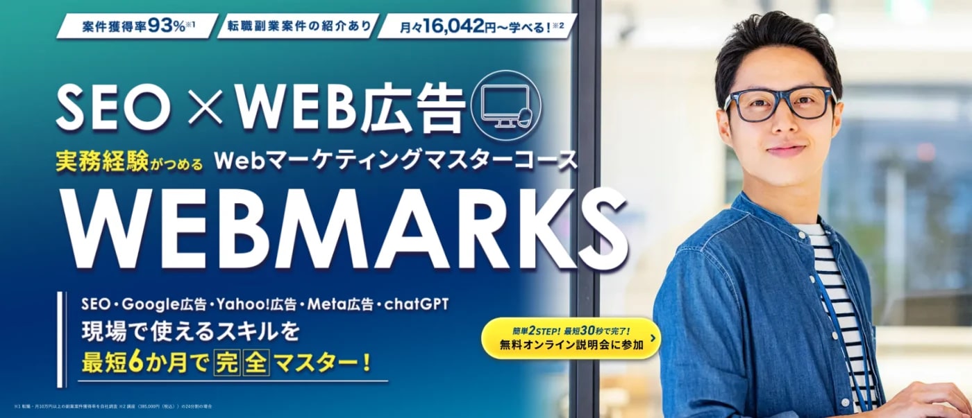 | こんな人におすすめ | Webマーケターとして網羅的な知識がほしい人・Webマーケターとしての転職バックアップがほしい人 |