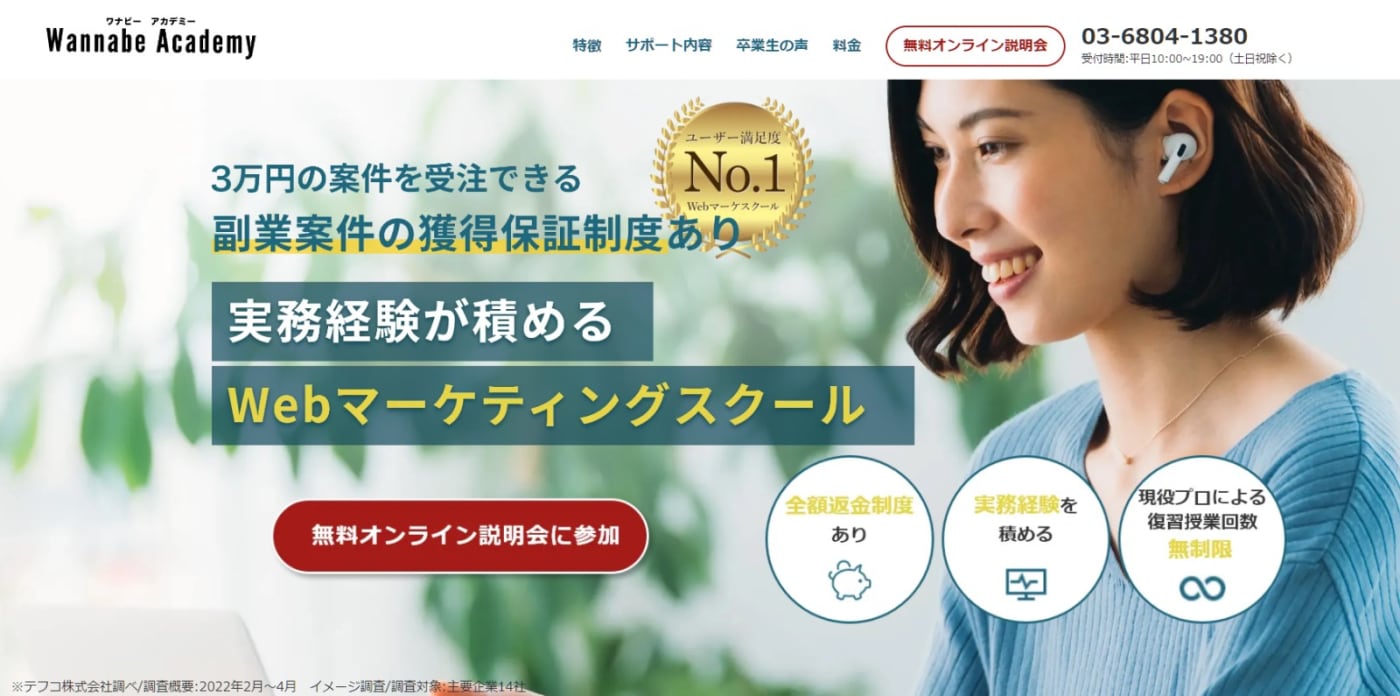 需要の途切れないWebマーケターとして活躍したいなら、スクールで実践的なスキルを身に付けるのが近道です。未経験者でも基礎から学べる、おすすめのWebマーケティングスクールを紹介します。おすすめのWebマーケティングスクールはこちらWannabeアカデミー(ワナビーアカデミー)