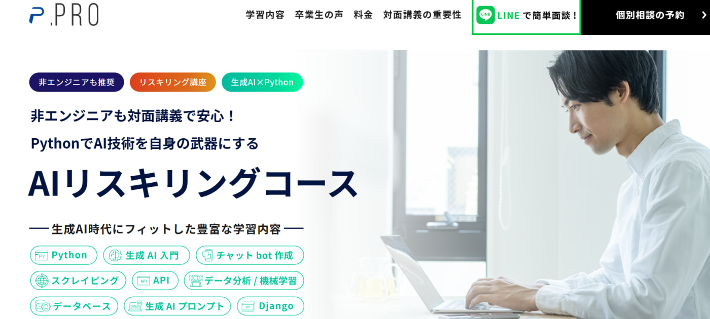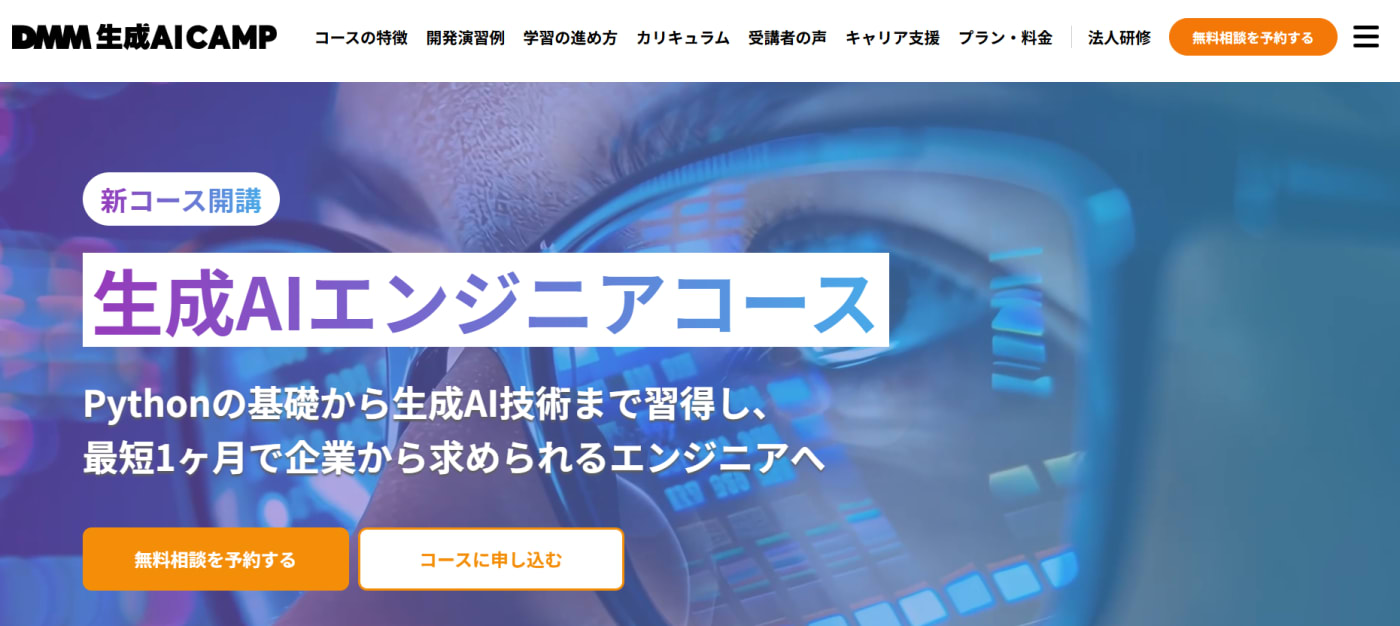 未経験からでも高度なスキルを習得できる点が強みで、特にAIや機械学習、データ解析の分野において業界で即戦力として活躍できるカリキュラムが組まれています。