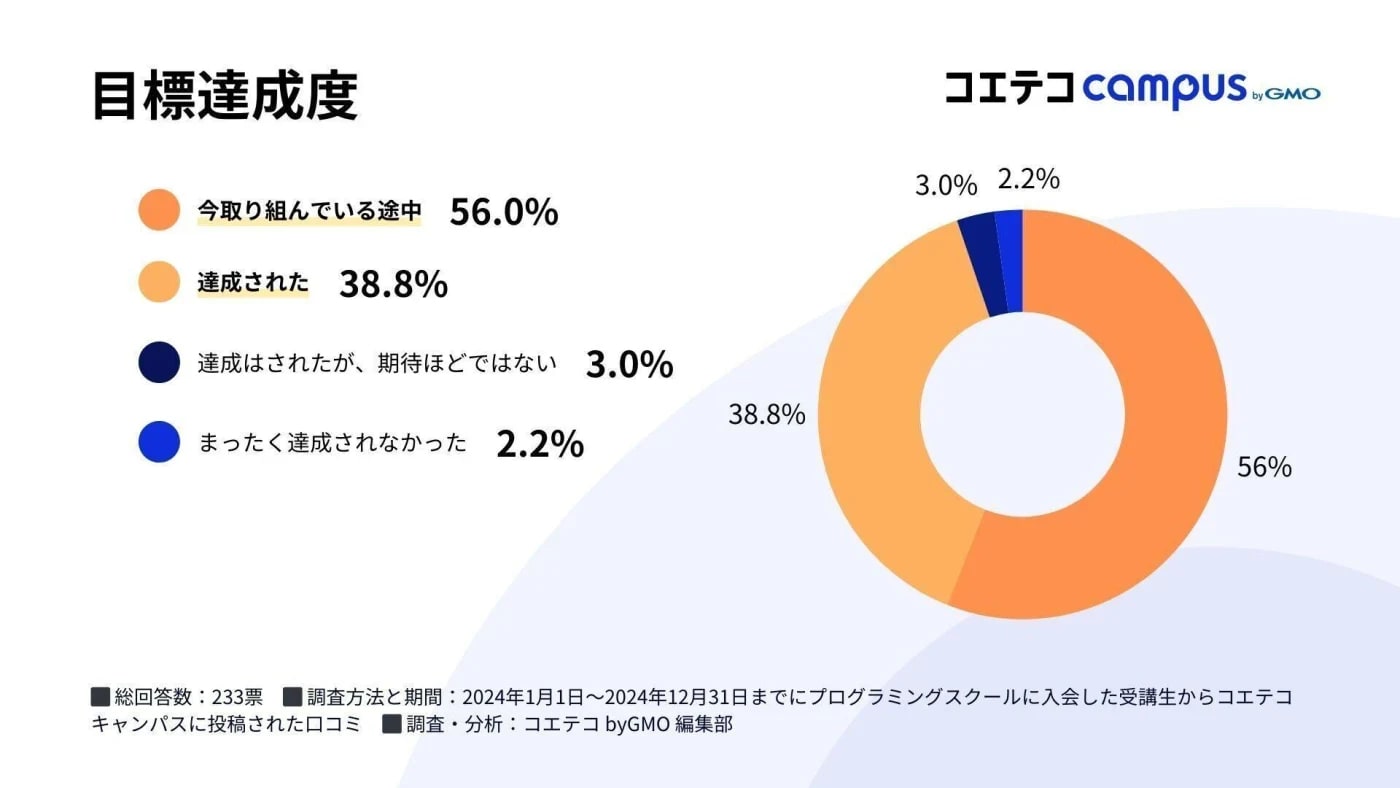 目標達成度について、「期待ほどではなかった」という回答が3.0%、「達成されなかった」が2.2%と少数派となっていることからも、プログラミングスクール受講はおすすめと言えます。