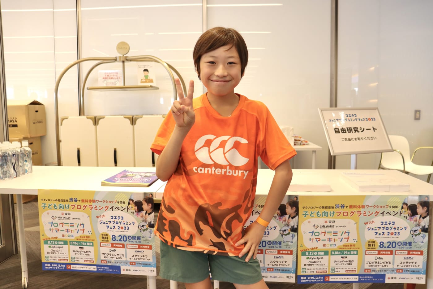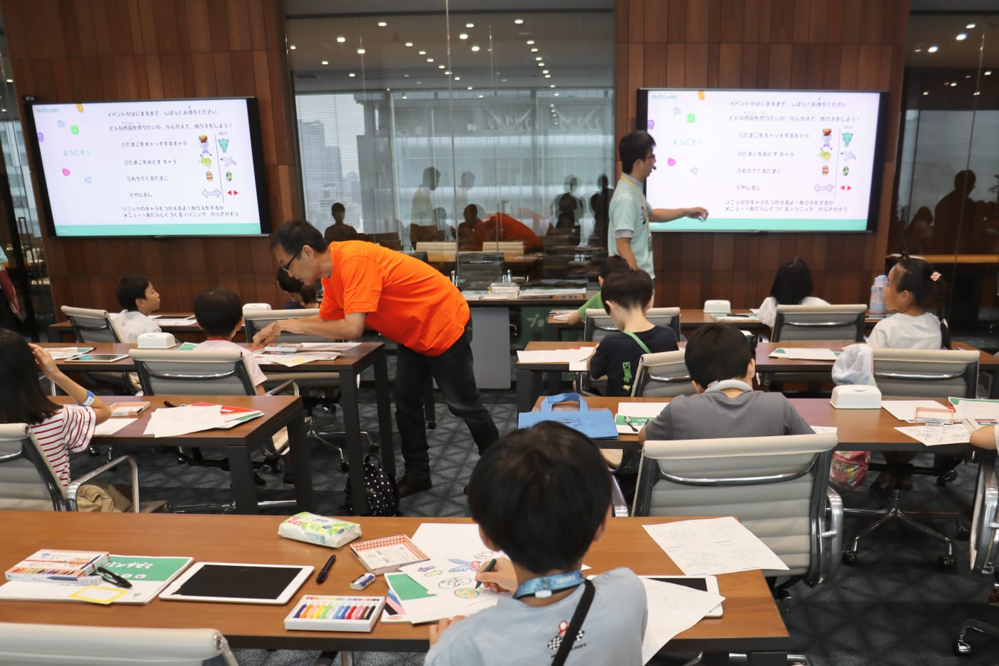 渋谷フクラス「GMOインターネットグループイベントスペース」の受付に、続々と集まってきた子どもたちと保護者の皆さん。子どもたちはワクワクどきどき、足取りも軽く、会場へと向かっていきます。では、わたしたちもまずはイベントスペースから見ていきましょう!