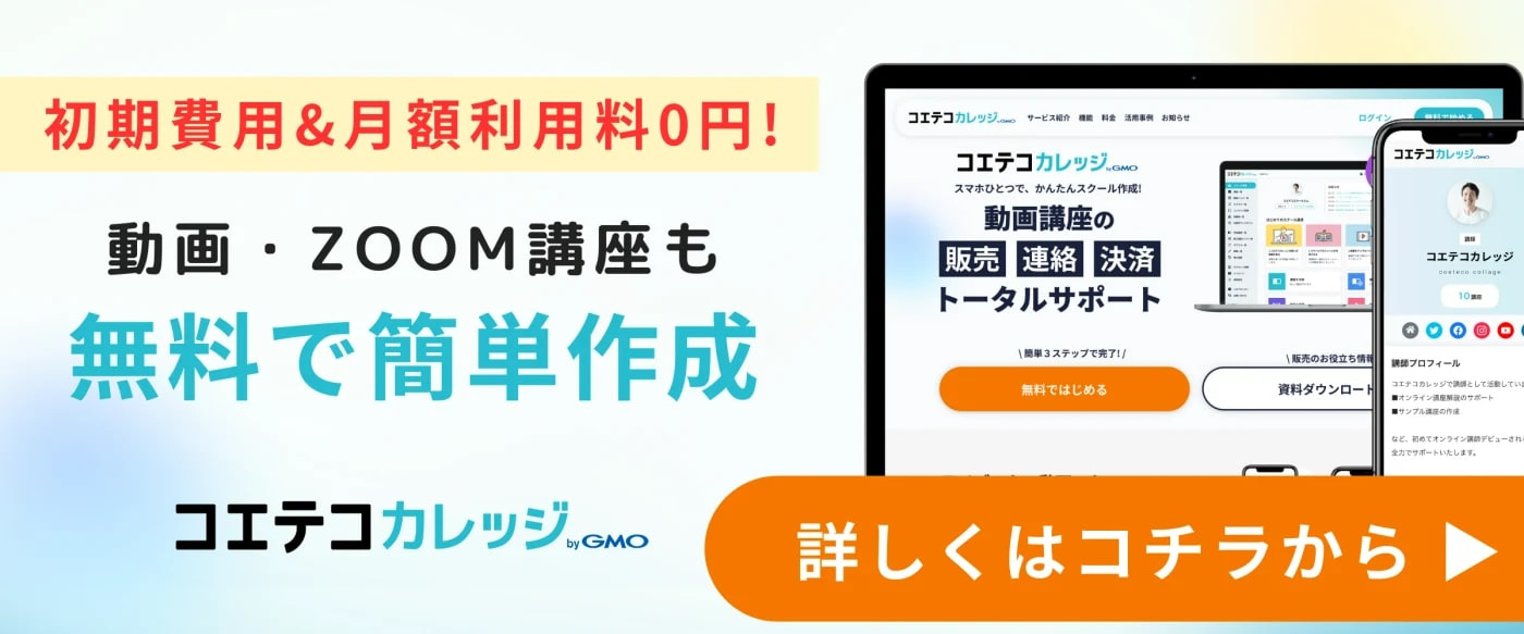登録費・月額費用無料で始められ、Zoomによるオンラインでの講座開催以外にも、講座動画(動画レッスン)も販売できるため、多角的に講座ビジネスに取り組めるシステムです。