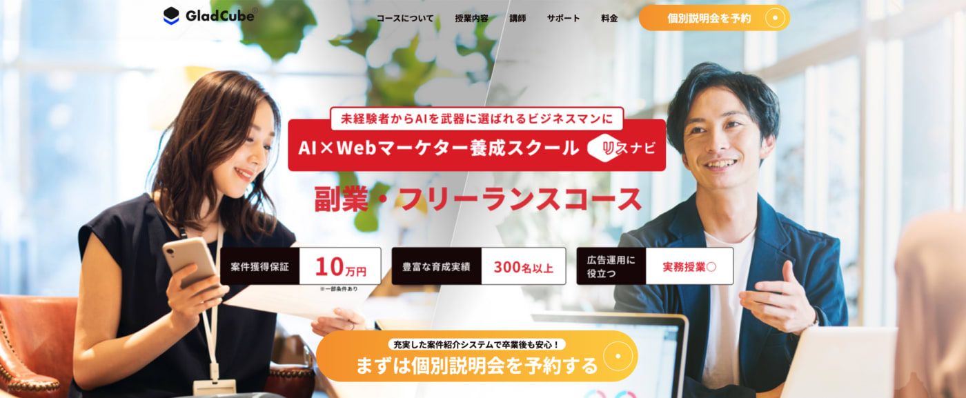 学習期間中は、現役のプロマーケターによる個別指導が実施されており、基礎から応用スキルまで習得することが可能です。オンライン完結なので、都合に合わせてスケジュールを調整でき、最短3ヶ月で即戦力を目指せます。