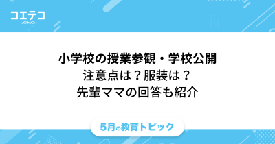 今回の教育トピックでは、授業参観/学校公開で親が見るべきポイントや、場にふさわしい服装など「知っておくと役立つ情報」を詳しく解説します。 先輩ママたちの体験談も紹介するので、ぜひ...