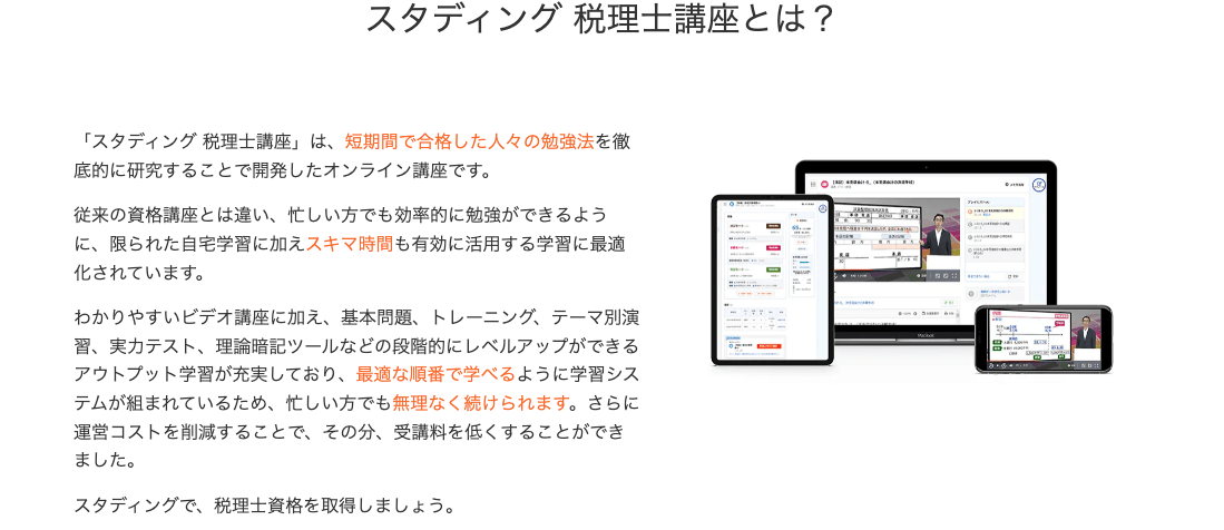 スタディングの税理士講座は、忙しい方でも効率的に学習できるよう最適化されているのが大きな特徴です。