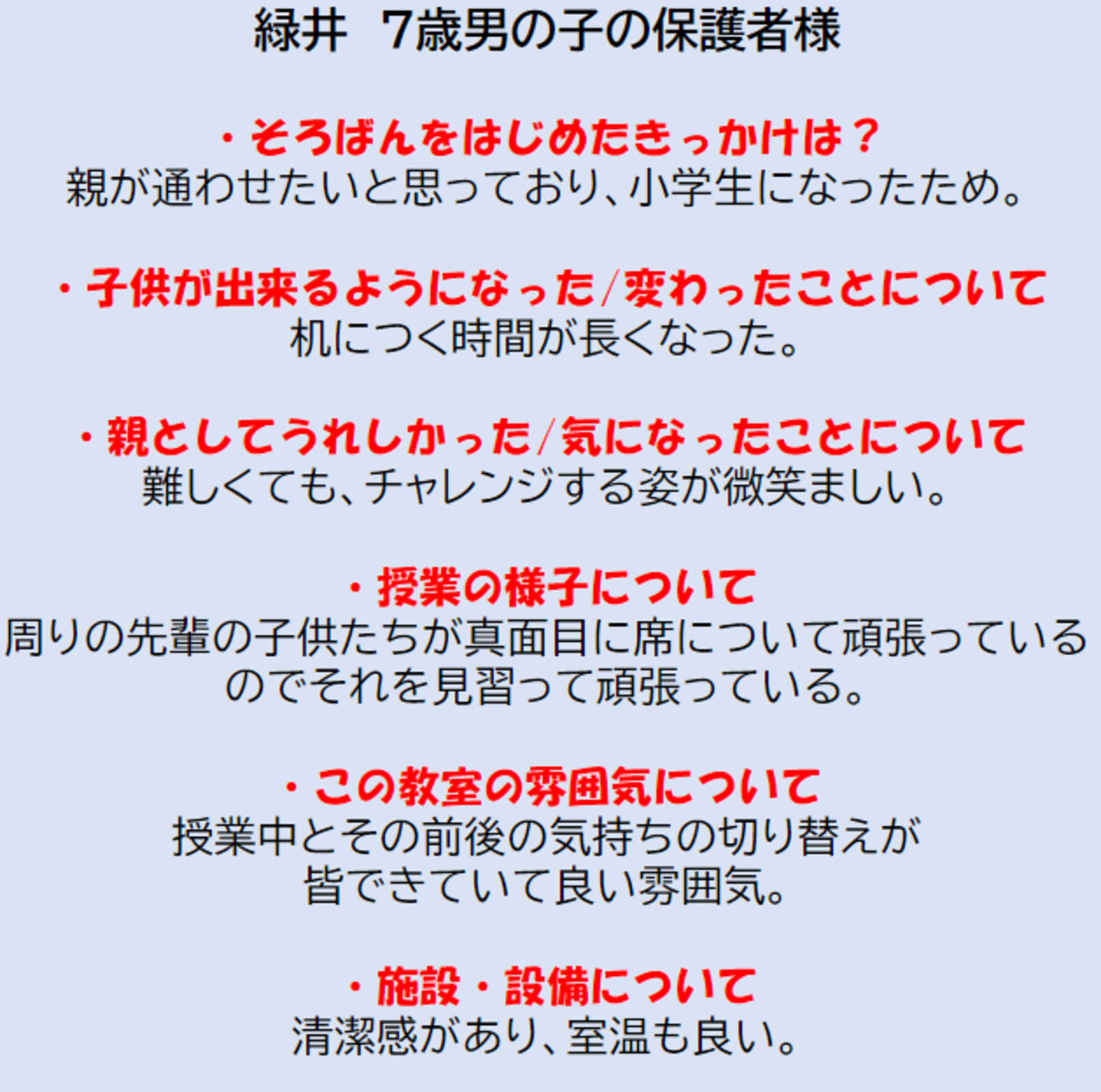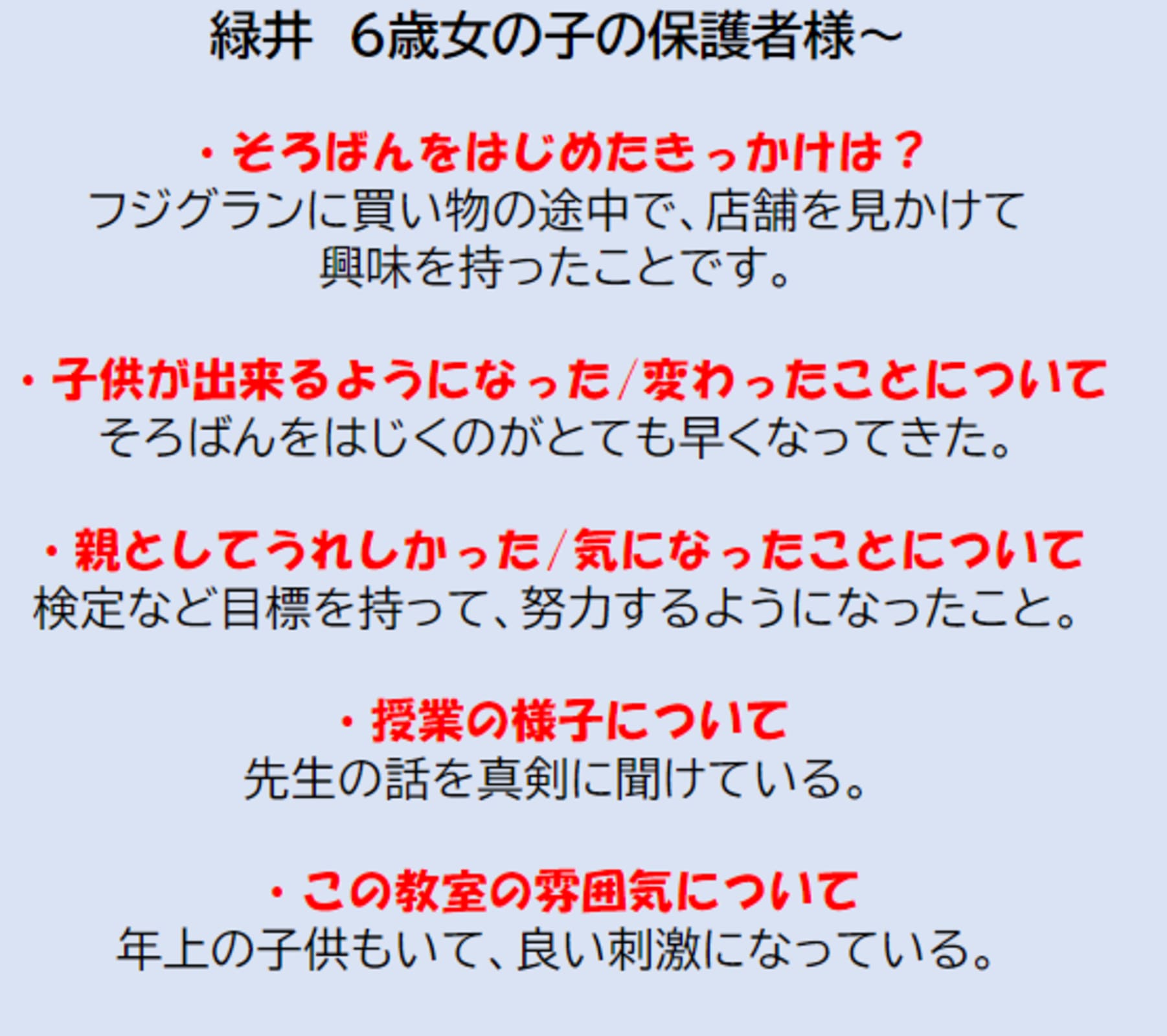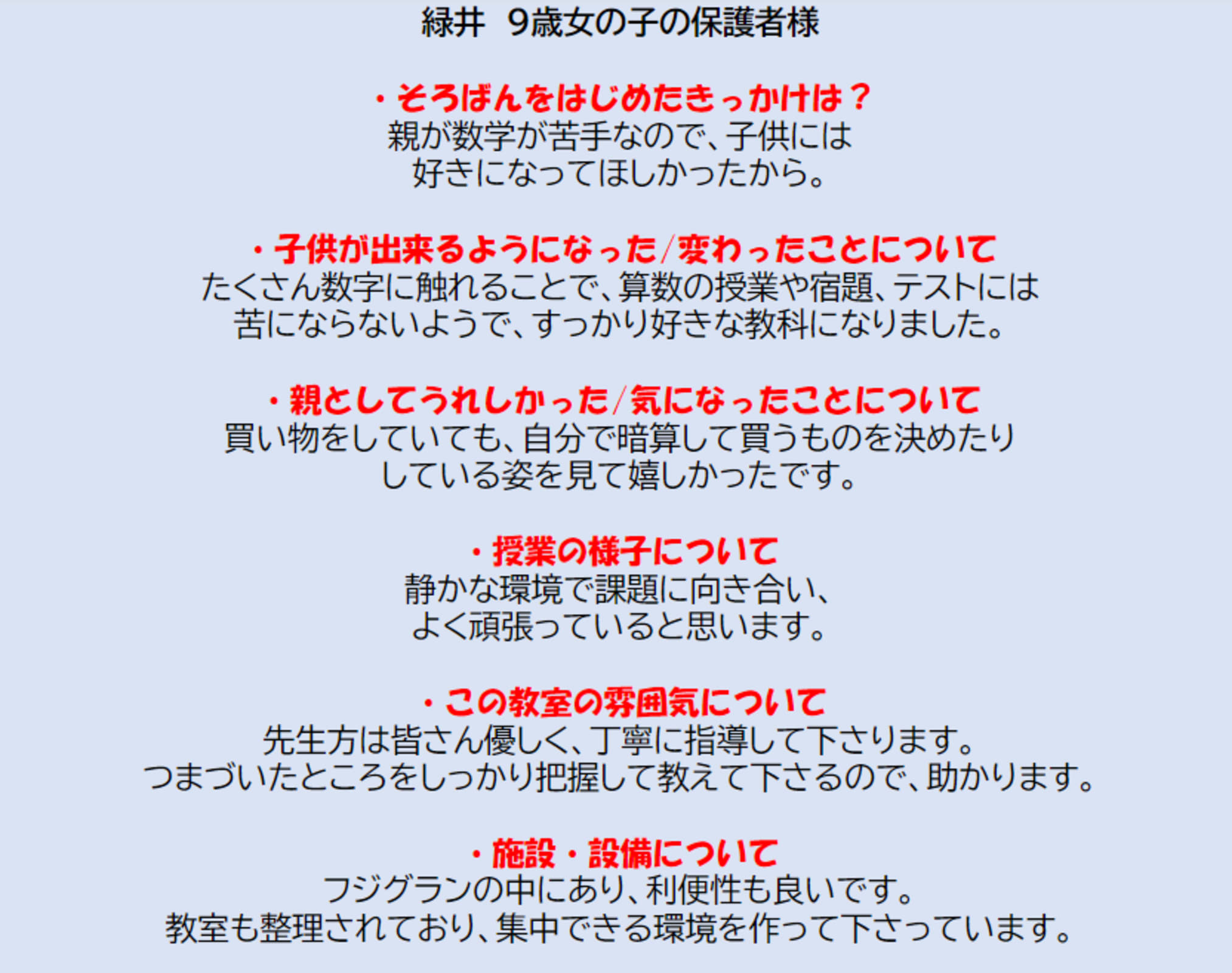 | 教室から一言 | 🔴教室風景そろばん教室88くんでは少人数制を採用しているため年少さんから通うことができ、一人一人きめ細やかな指導を行ってまいります👌さらにショッピングセンター内にあるので、お子様を預けてる間に買い物ができるから効率的🛒急な用事などでお休みしても振替制度があるので、別の日に振替ることが無料で何度でも可能です😁無料体験レッスンも随時受け付けております🎶お子様の可能性を確かめてみませんか🌟【保護者様の声】 |