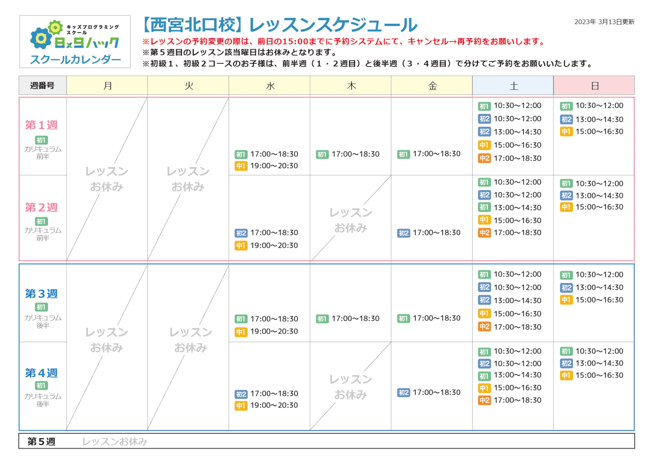 授業スケジュール 水曜日 16時30分~19時30分