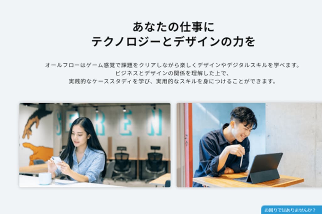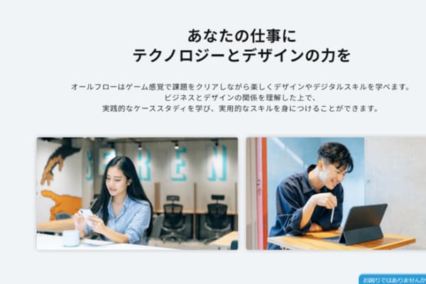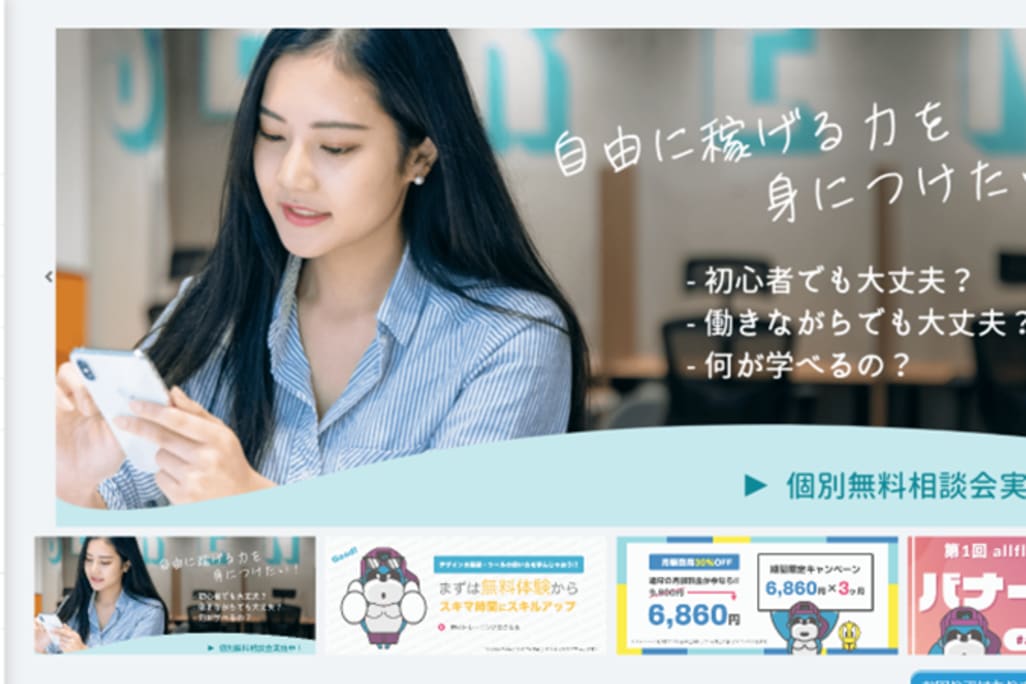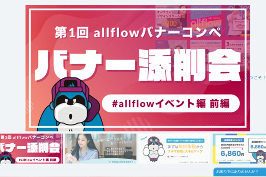 allflow (オールフロー) は、デジタルデザイン・バナーデザイン・webデザイン・ロゴデザイン・マーケティングをゲーム感覚で学べるeラーニングスクールです。本スクールでは、ゲーム感覚で課題をクリアしながら楽しくデザインやデジタルスキルを身につけることができます。プロのデザイナーが添削やメンタリング質問などを通じて徹底サポートを行うので、未経験者の方も安心して学習に望めます。オンライン完結なので、いつどこでも学ぶことができるので、就業中、学生の方にもおすすめです。