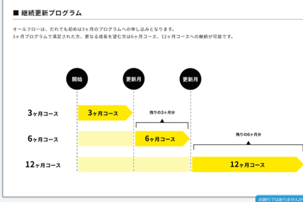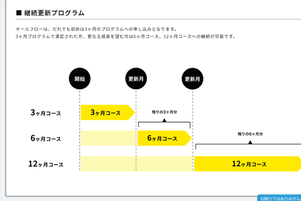 オールフローでは、受講生が無駄なく学習できるよう、継続更新プログラムを採用しています。初回から長期プログラムを選ぶのではなく、3ヶ月からスタートして6ヶ月、12ヶ月と継続の有無を選択できるので、自分のペースに合わせて学習できます。