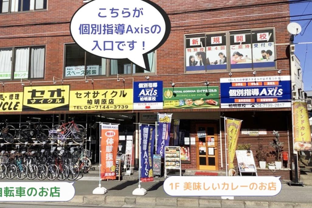 JR常磐線 / 東武野田線 柏中より徒歩3分! 鈴木ビル2Fが個別指導Axis柏明原校です。1Fは自転車とカレーのお店があり、真ん中が入口です! |