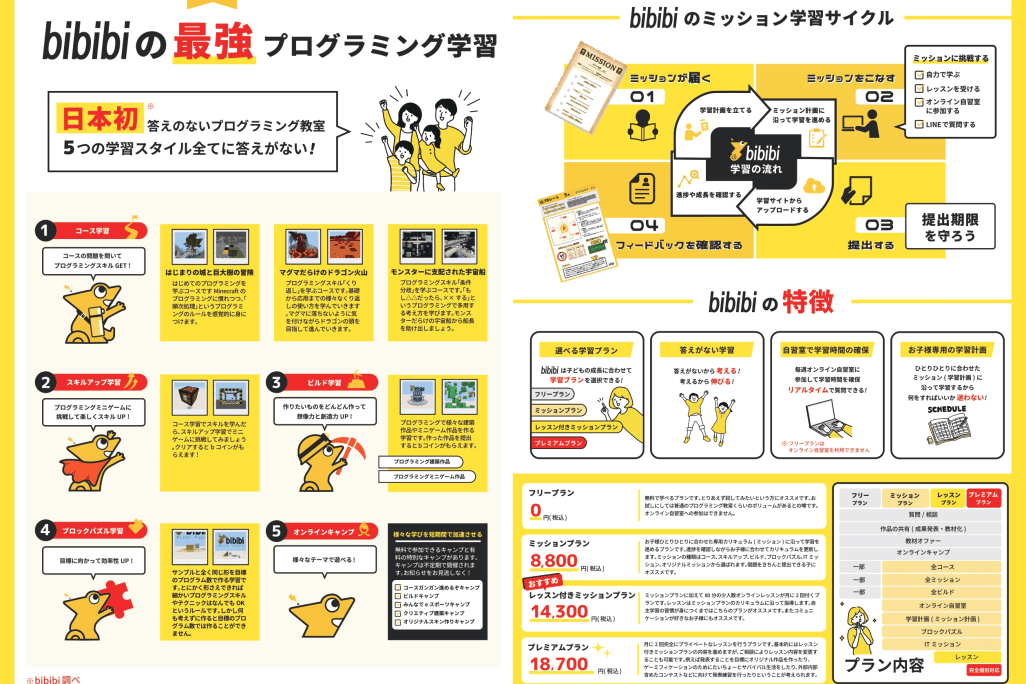 bibibiは勉強が苦手な子でもゲーム感覚で「好き」と「得意」で成長していけるマイクラプログラミングのオリジナル教材を取り揃えています。