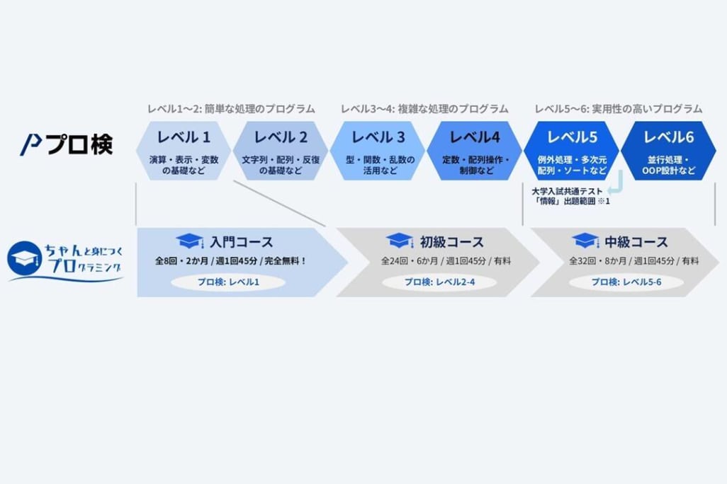 ※大学入学共通テスト「情報」のプログラミングの出題範囲は、プロ検レベル4~5に相当します。