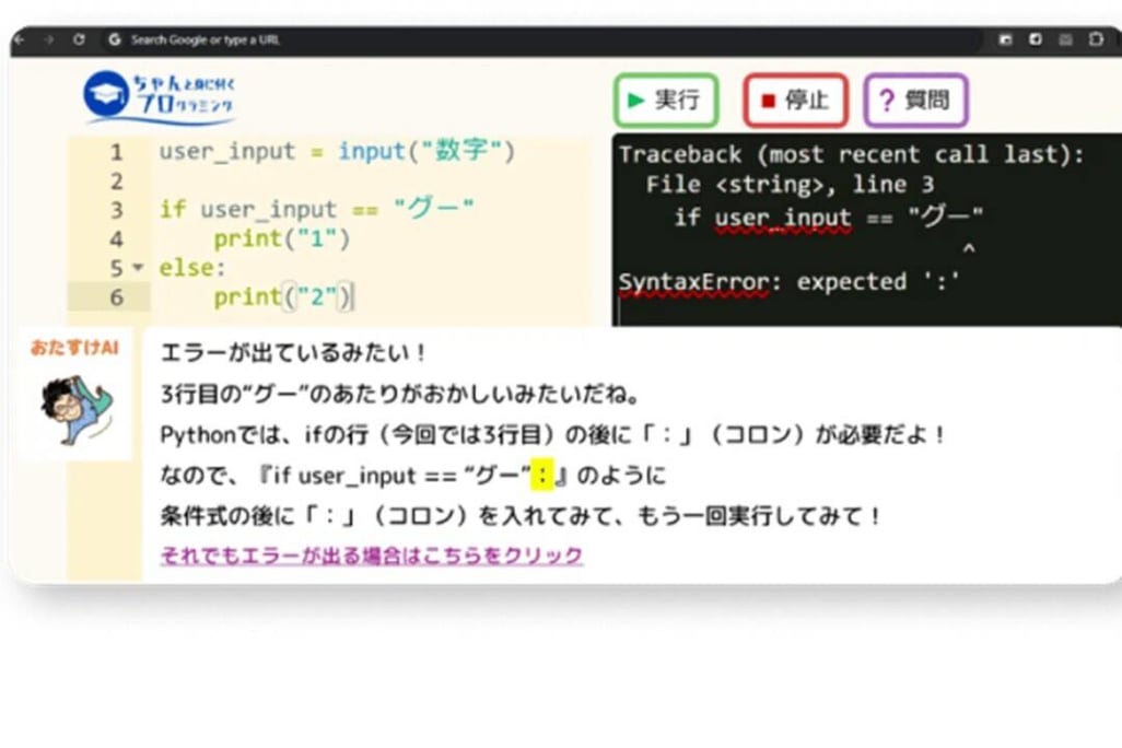 【ちゃんと身につくプログラミング】では、AIによるエラー解析・自動アドバイス機能や、それでも対応できない場合は個別チャットサポートで、徹底的に「つまずき」を防ぎます。