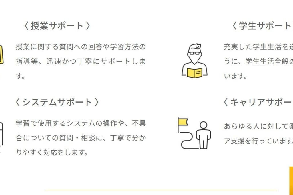 オンラインでの大学ですが、授業や学生生活、システムの操作などの困りごとに対し、万全のサポート体制が用意されています。