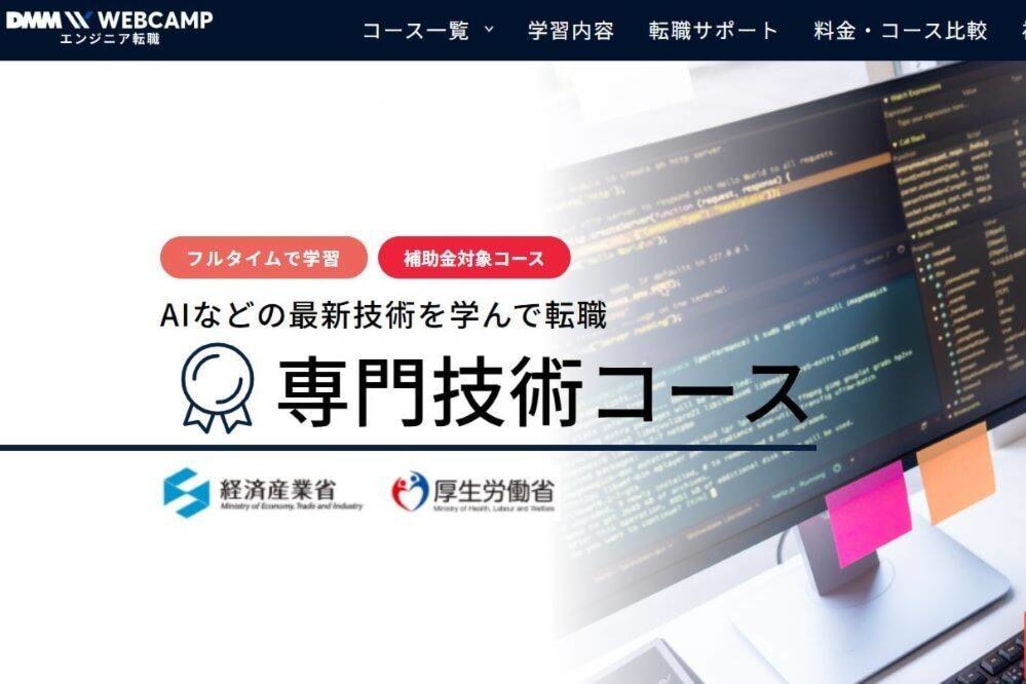DMM WEBCAMP COMMITには、期間別に短期集中コース(3ヶ月)と専門技術コース(4ヶ月)、就業両立コースがあります。専門技術コース(4ヶ月)は、経済産業省の第四次産業革命スキル習得講座および厚生労働省指定の専門実践教育訓練給付金制度の対象講座で、条件を満たせば修了後支払った受講料の最大70%(支給限度額:560,000円)が教育訓練給付金として支給されます。