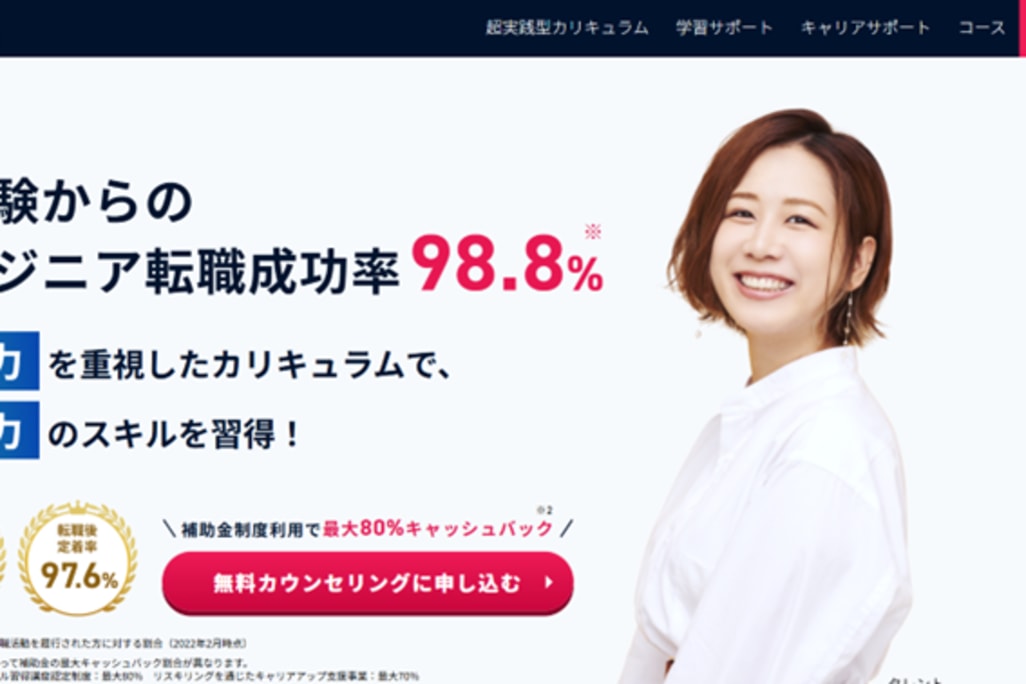 転職サポートの充実をうたう大人向けプログラミングスクールは多々ありますが、なかでも「最後まで面倒見がいい」と定評あるのがDMM WEBCAMP COMMITです。