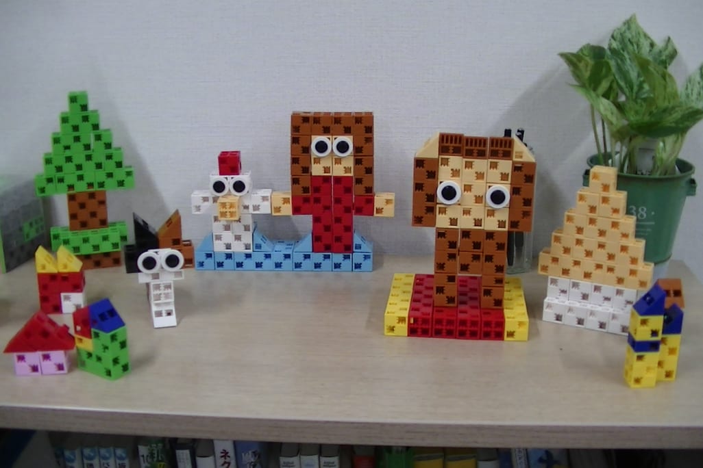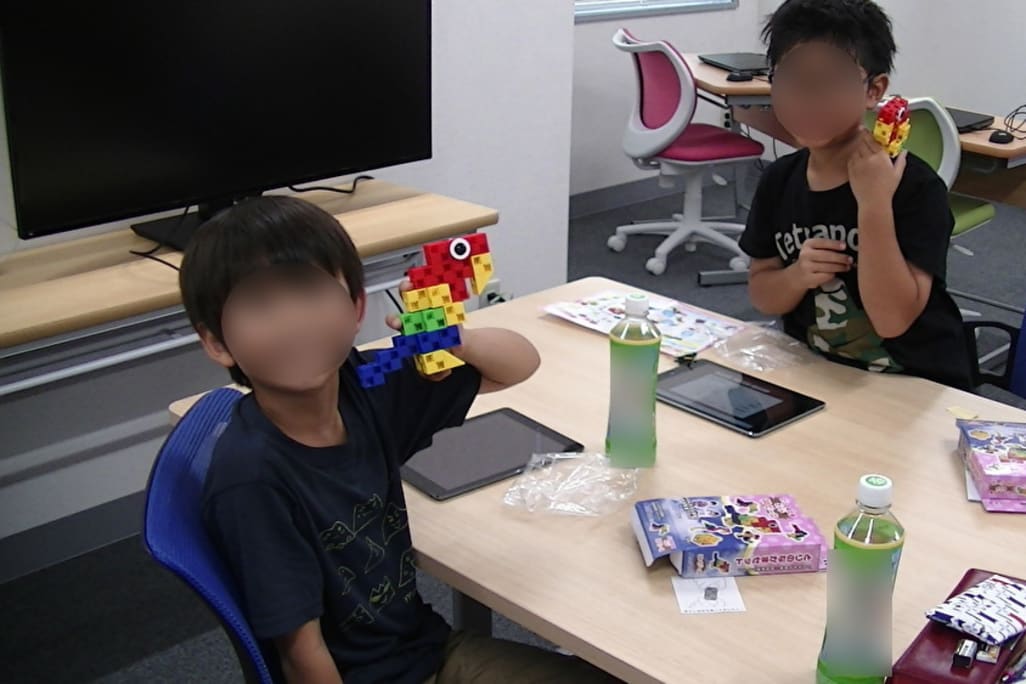 使用教材はアーテックオリジナルの「アーテックロボ」で、タテ・ヨコ・ナナメに接続できる、立方体に近いブロック「アーテックブロック」を使って組み立てます。一般的なブロック教材に比べて自由度が高いので、立体が苦手なお子さんでも思うとおりのロボットが組み立てられるでしょう。レゴ®︎ブロックよりも色合いがやさしめなので、女の子もとっつきやすいはずです。