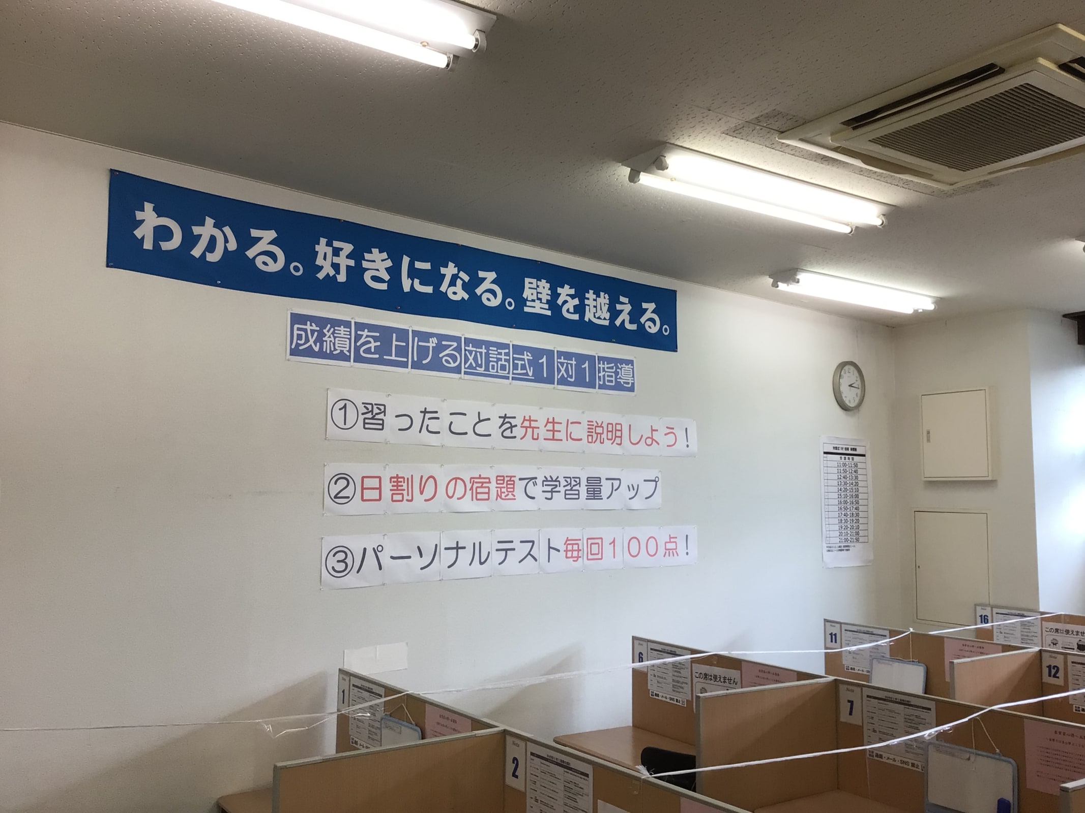 毎週平日(水曜日以外) 16:55~(90分) 毎週土曜日11:05~(90分)、13:35~(90分) ※生徒様のご予定に合わせて、スケジュールは柔軟に対応可能です。ご見学の際にご相談ください。 |
