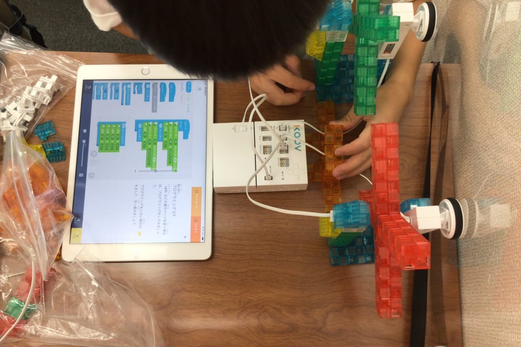 ソニー・グローバルエデュケーション開発の教材「KOOV®」を活用し、ブロックを組み立てながらプログラミングを学ぶことで、子どもたちは「どうしたらもっと面白くできるかな?」と自ら考え、試行錯誤する力を伸ばしていきます。
