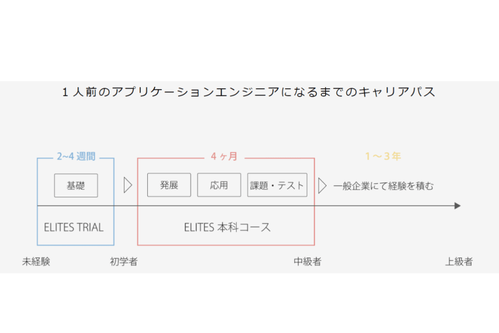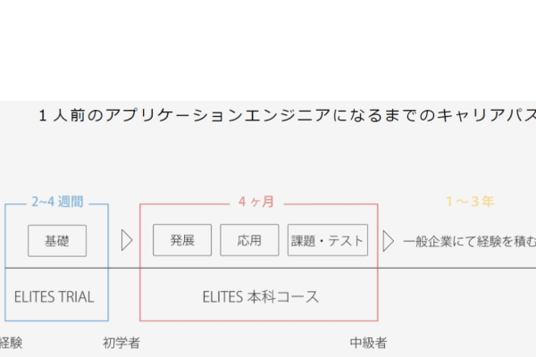 ELITES(エリーツ) WEBエンジニアコースは「本物の職業人を輩出」する事に注力しています。4~5ヶ月間における短期集中プログラムにより、有名企業でも内定を取れるレベルの人材を育成するカリキュラムを用意しております。そこでトレーニン グを積み、一流と言われるエンジニアを目指しましょう。