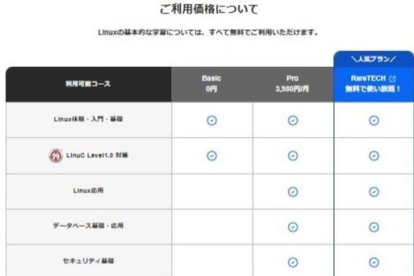 Linuxの基本的な学習は無料で学べます。Linuxの応用やデータベース、セキュリティ、質問対応などは有料で提供されています。