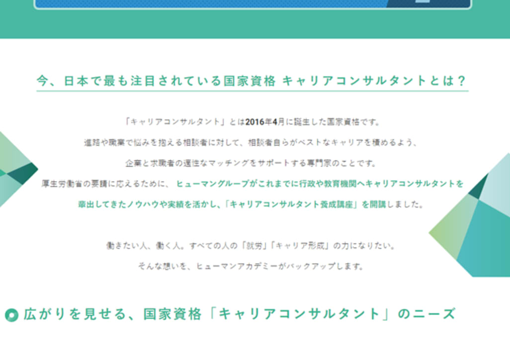 ヒューマンアカデミーキャリアコンサルタント養成講座は、キャリアコンサルタントを目指せるスクールです。同資格は2016年4月に誕生した国家資格であり、進路や職業で悩みを抱える相談者に対して、相談者自らがベストなキャリアを積めるようにと、企業と求職者の適性なマッチングをサポートする専門家の仕事です。