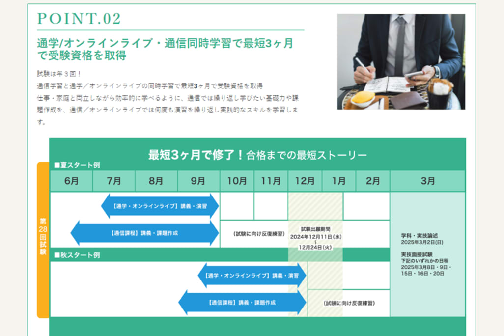通学/オンラインライブ・通信同時学習で最短3ヶ月で受験資格を取得可能