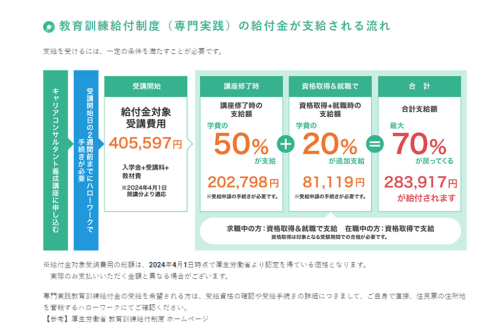 教育訓練給付制度(専門実践)の給付金が支給対象コースとなるので、利用によって最大70%支給されます。