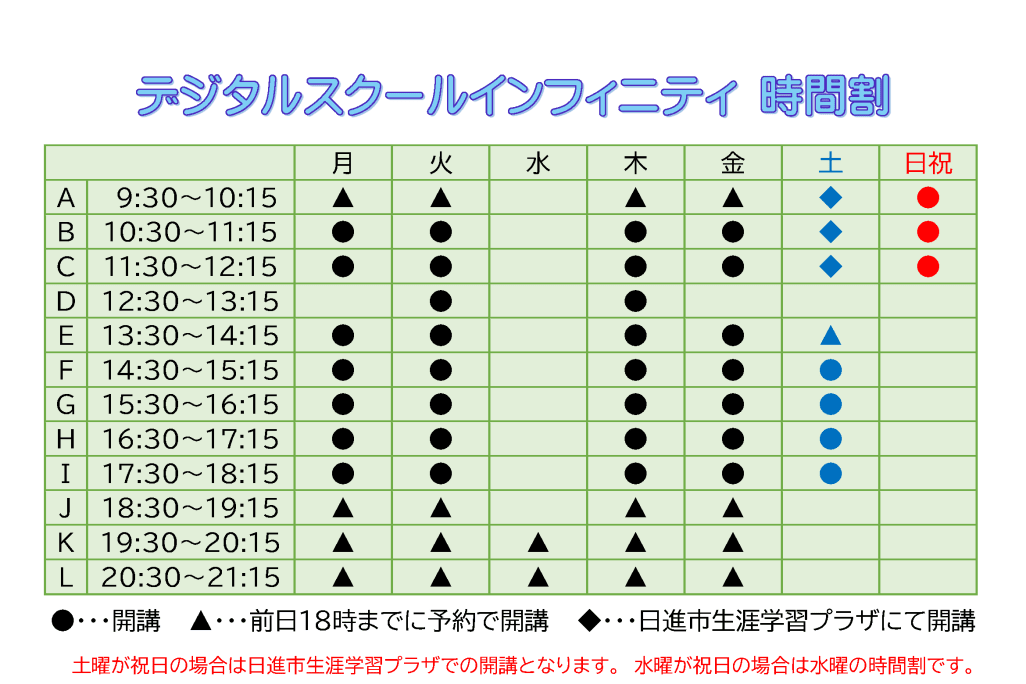 | 授業スケジュール | 月~金 9:30-21:15/土 9:30-18:15/日祝 9:30-12:15 |