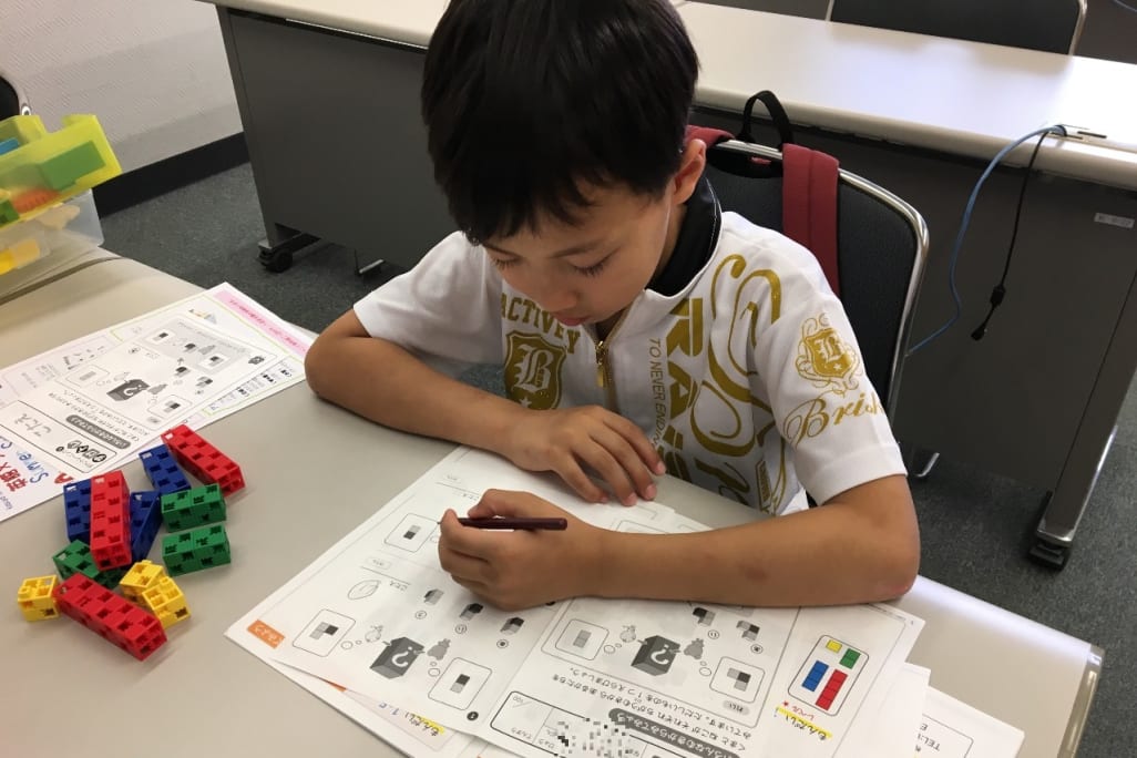 ブロックや歯車をさわりながら考えていきますので、図形問題が苦手なお子様でも、試行錯誤を繰り返して楽しみながら問題を解くことができます。