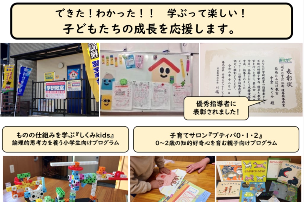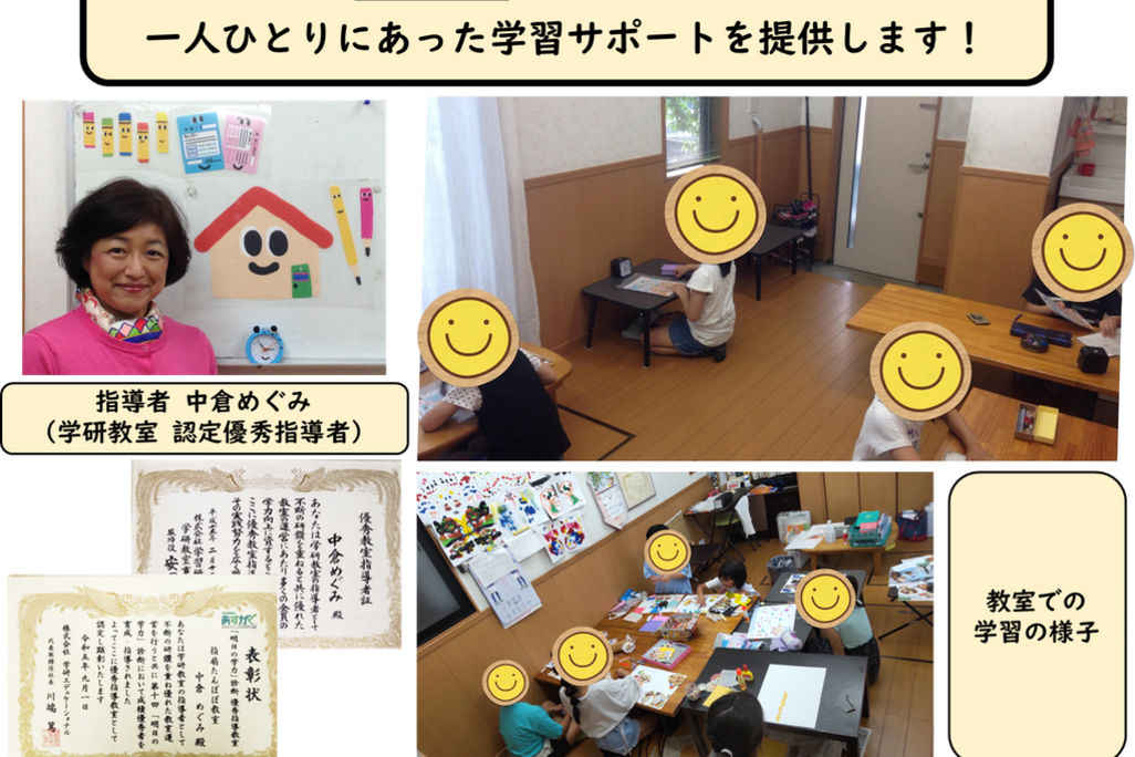 ☆「自ら学び、考える習慣をつけること」を目指し、しっかりと基礎学力をつける指導を行っています。また、全国テスト第一位を毎回輩出するなど、発展的な学習に挑戦し論理的思考力も伸ばしています。 ☆幼児期は学力の素地をつくる大事な時期。幼児の指導はお任せください。 ☆指導者中倉は小学校教諭経験があり、学研で25年間指導し優秀指導者に認定されています。 また、県教育委員会の家庭教育/学習アドバイザーとして、県内各地で講演活動中です。 地域子育てサロンの運営、ファミリーサポート等ボランティアとしても活動しています。 ◎漢検・数検・英検準会場(合格率 100%) ◎不登校、特別支援のご相談も承ります。
