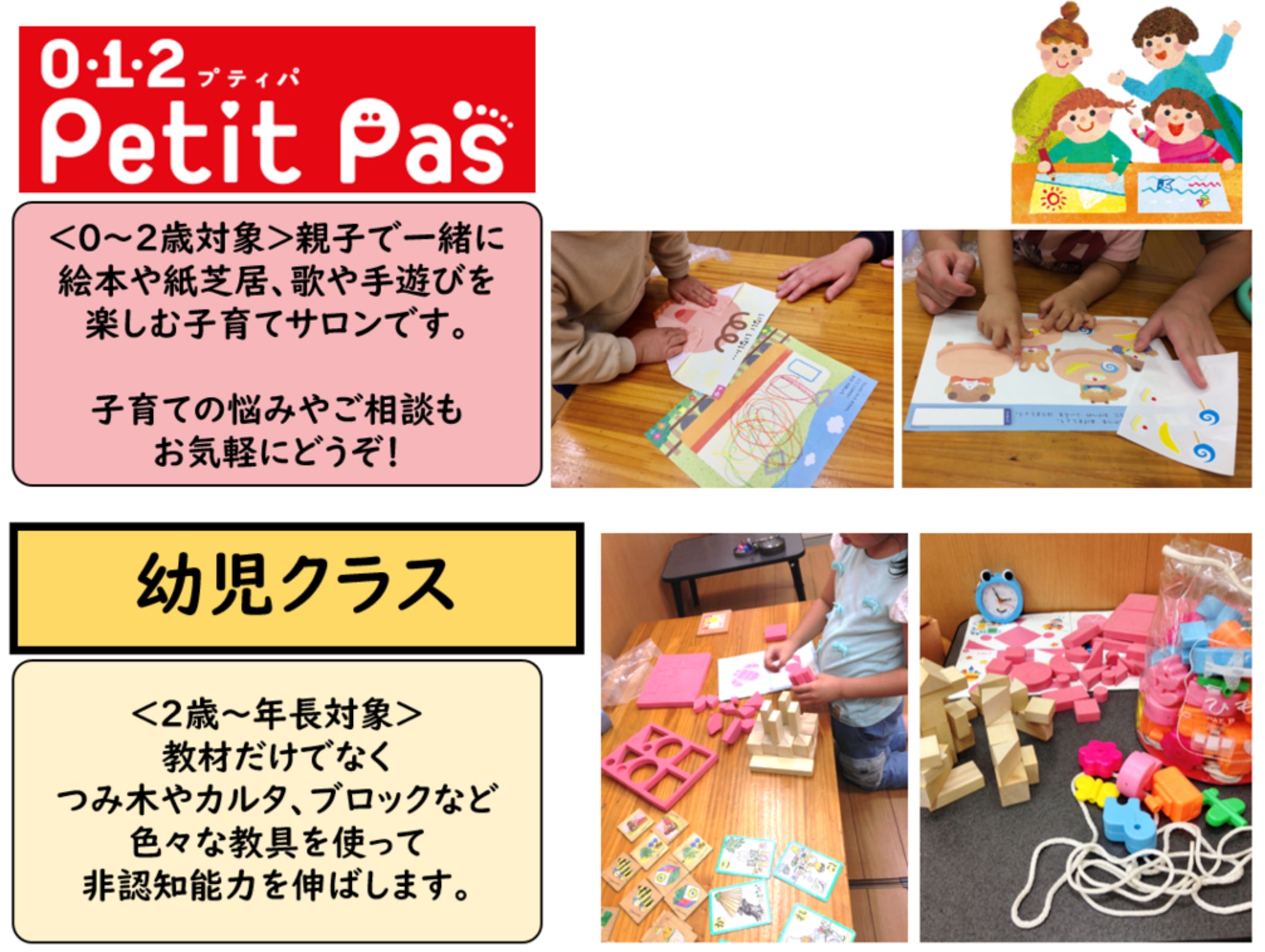 春の入学にむけて、準備をはじめませんか?全国テスト一位を多数輩出する当教室にお任せください。 学びはスタートが大切。学習習慣を身に着けるのは低学年での取り組みがカギです。 幼児コースは、プリントだけでなくパズルや積み木などの教具も使い楽しみながら学習します。 埼玉県家庭教育アドバイザーで小学校・幼稚園教諭一級免許を持つ指導者です。 学習に不安な方、先取りで進みたい方、お子様の実力に合わせて指導します。 ●2歳~3年生の無料学習体験参加者募集中 人気教室につき定員はわずか。早めにご予約を。 ●『012プテイパ』は、絵本や紙芝居、工作など親子で楽しい時間を過ごします。 9月18日 10月23日 10時15分から11時 日程が合わない場合はご相談ください。 ●10月25日漢字検定 受付中 |