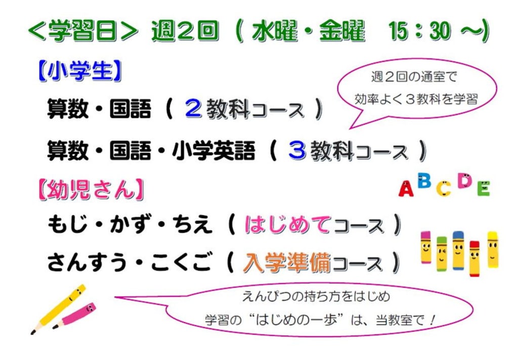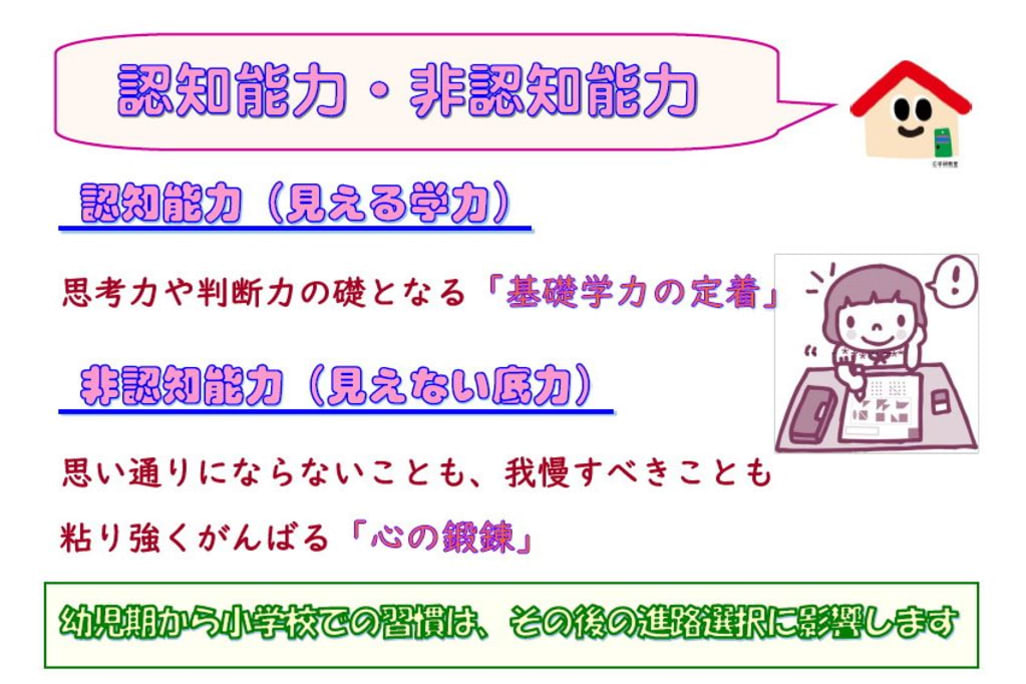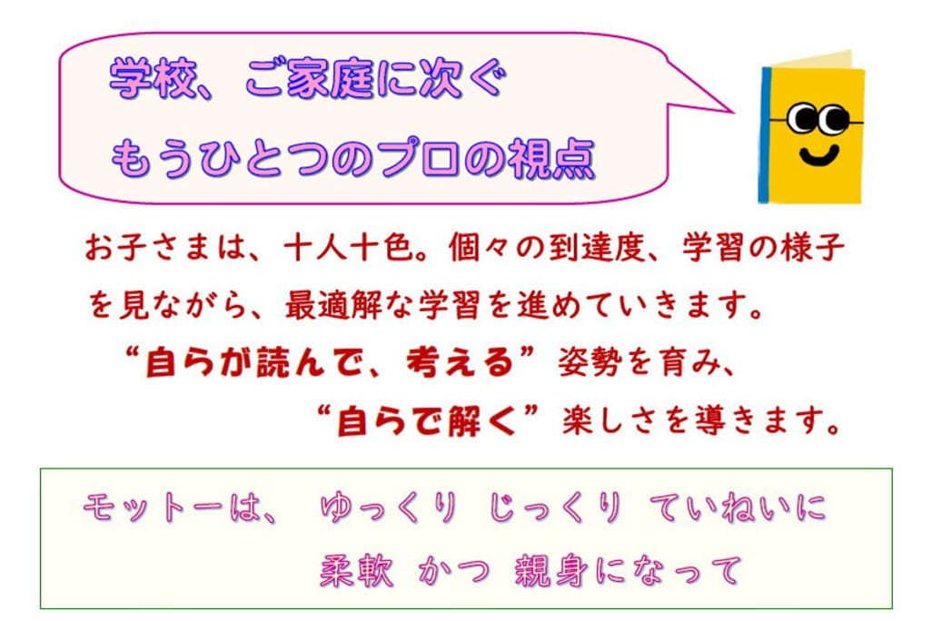 さあ、当教室で「規則正しい学習習慣」をつけて、親子で「心の安定」を図りましょう!! コツコツと積み重ねる基礎学力【認知能力】 ご成長過程に不可欠な底力【非認知能力】 当教室にお通いのお子様たちは、着々と身につけています! ★認知能力 【にん】にんげんりょく(人間力)につながる 【ち】ちのう(知能)基礎学力は「見える力」 ★非認知能力 【ひ】ひとりだち(独り立ち)自立できる子に 【にん】にんたいりょく(忍耐力)など 【ち】ちのう(知能)と共に育む「見えない力」 ~当教室は~ ◆時間制・少人数学習◆ お時間は、別途ご案内します ◆駐車スペースあります◆ 教室前・天王神社バス停の脇 まずは、お気軽にお問い合わせくださいませ。 |