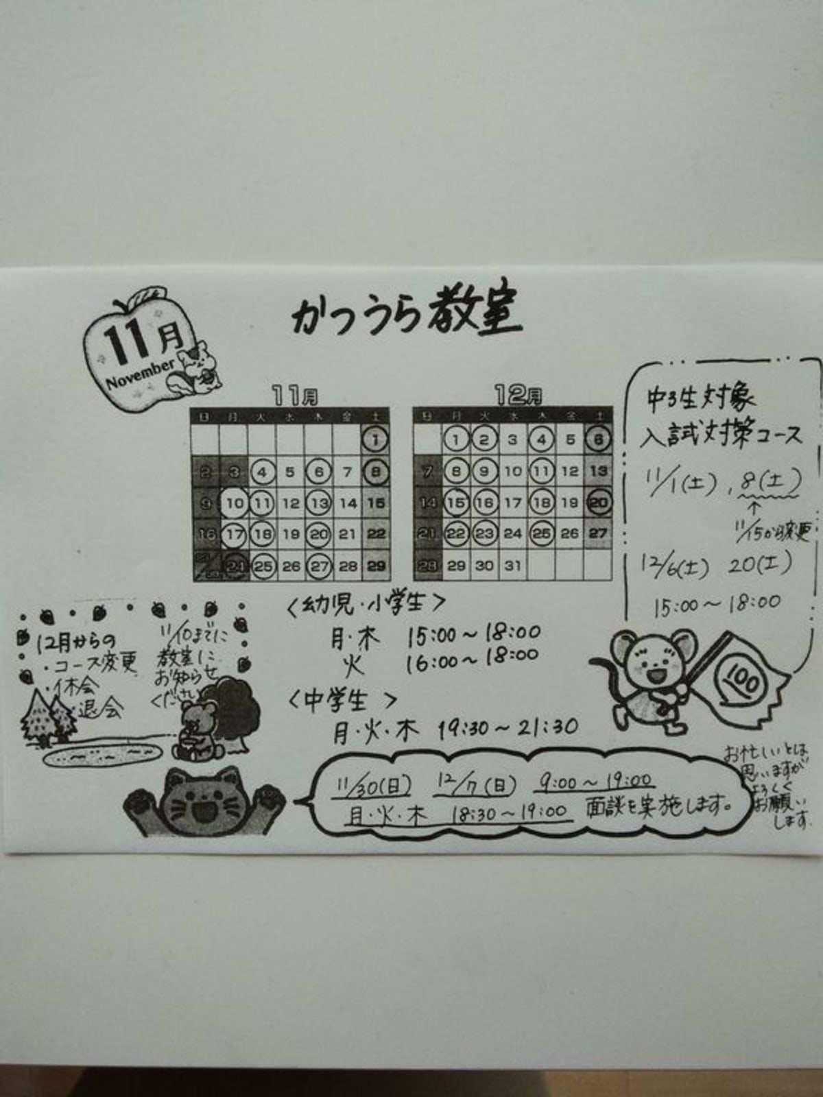 | 授業スケジュール | 月 14:00~20:00位まで / 火 14:00~20:00位まで / 木 14:00~20:00位まで |