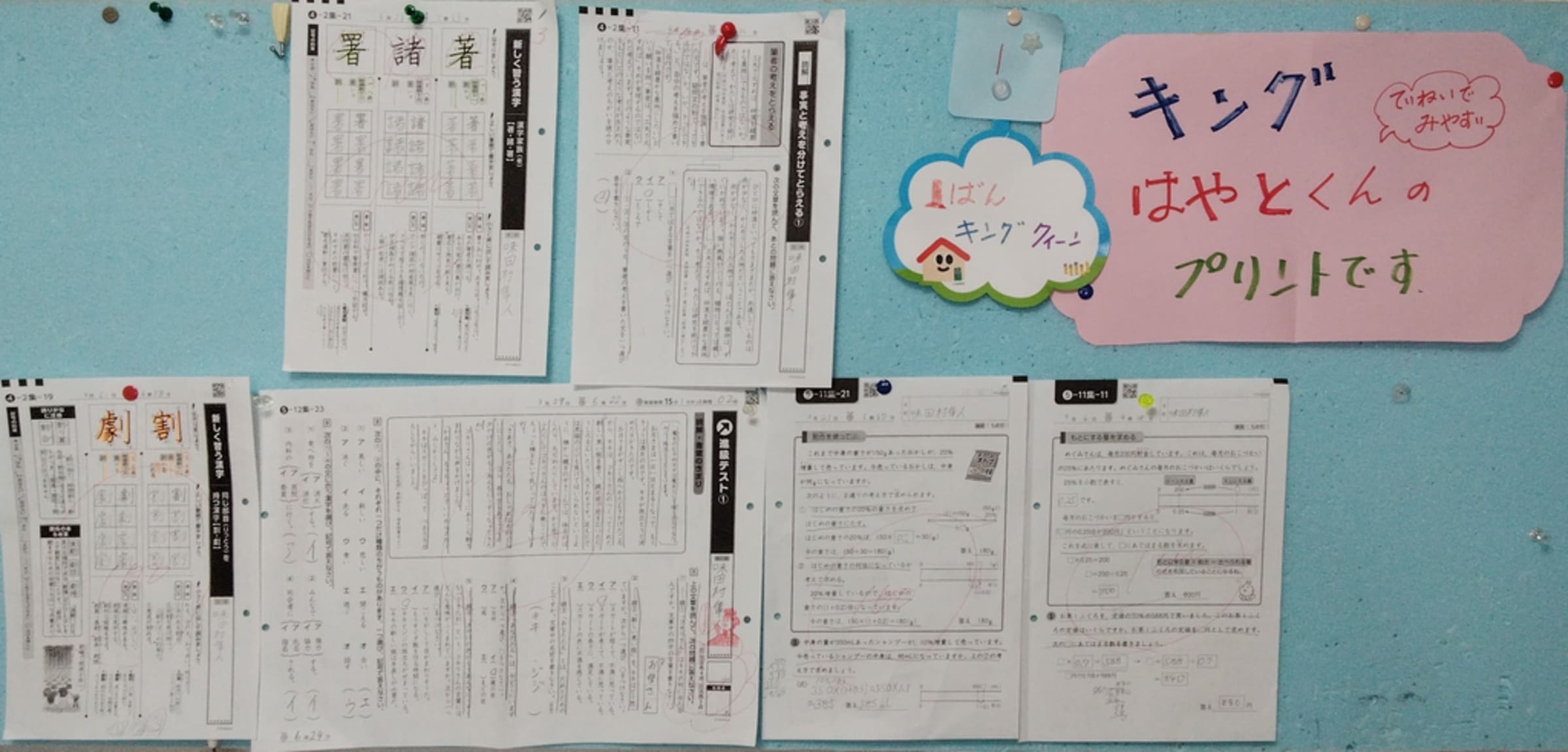 学研の教材は学校の指導要領に基づいて作られています。計算、漢字、読解の他、図形、コンパスの使い方、言葉のきまり(主語、述語、辞書、ことわざ)表現など、すべて学べるとても良い教材です。宿題は毎日算数、国語1枚ずつです。ご家庭でも丁寧学習が身につくように指導しています。集中学習が身についていくと学習がとても楽になりテストの点もあがってきます。