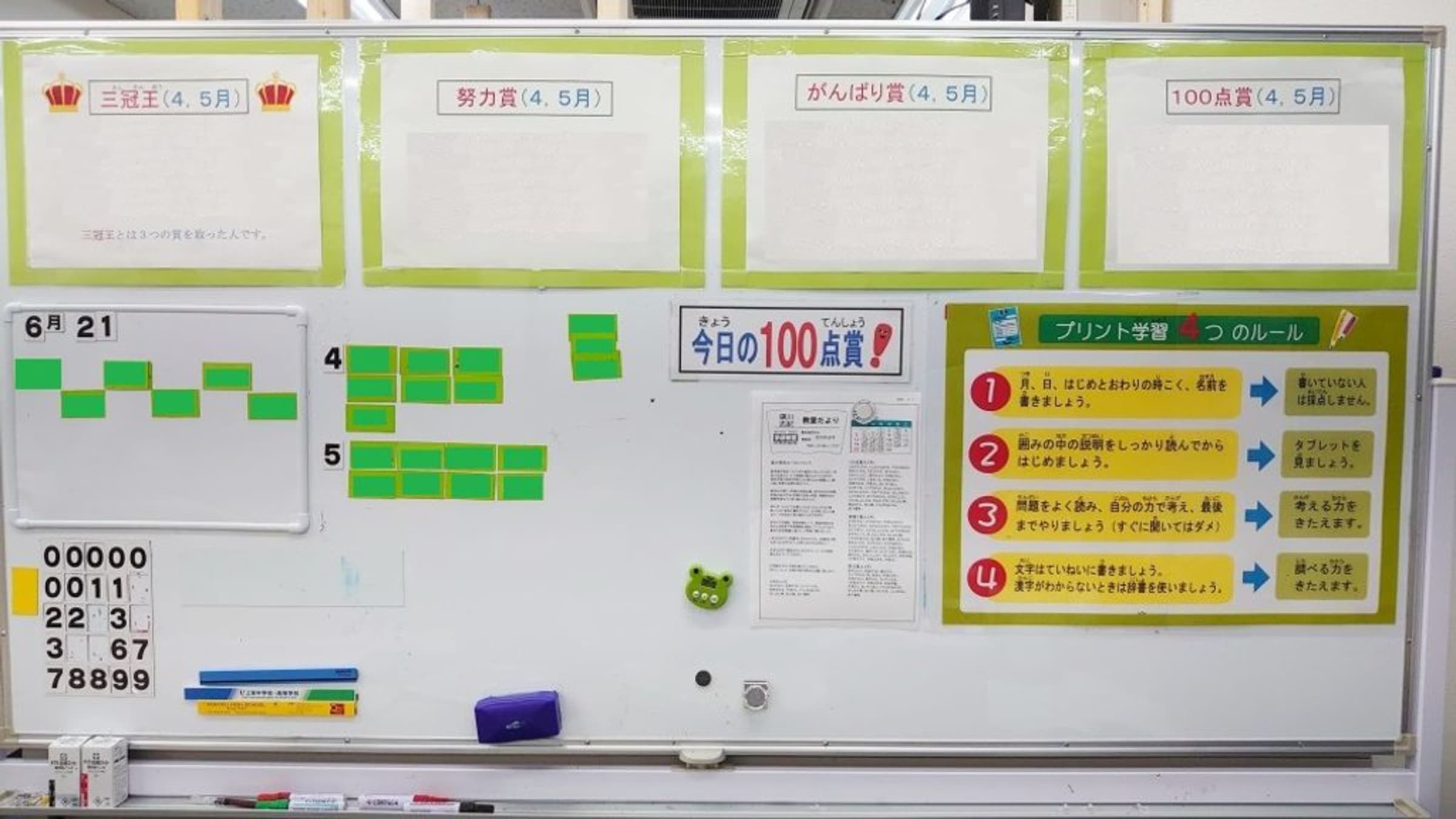 教室から一言 当教室では、感染防止のため、手洗い、うがい、検温、消毒、換気等を徹底しておりますので、お子様に安心して通っていただけます。体験学習では、算数と国語の「診断テスト」を無料で受けていただけます。診断テストにより、お子さまの学力を把握し、学習の出発点を決定しますので、お子様に合ったところから学習できます。ぜひこの機会に体験学習にご参加下さい。幼児、低学年の方も大歓迎です。