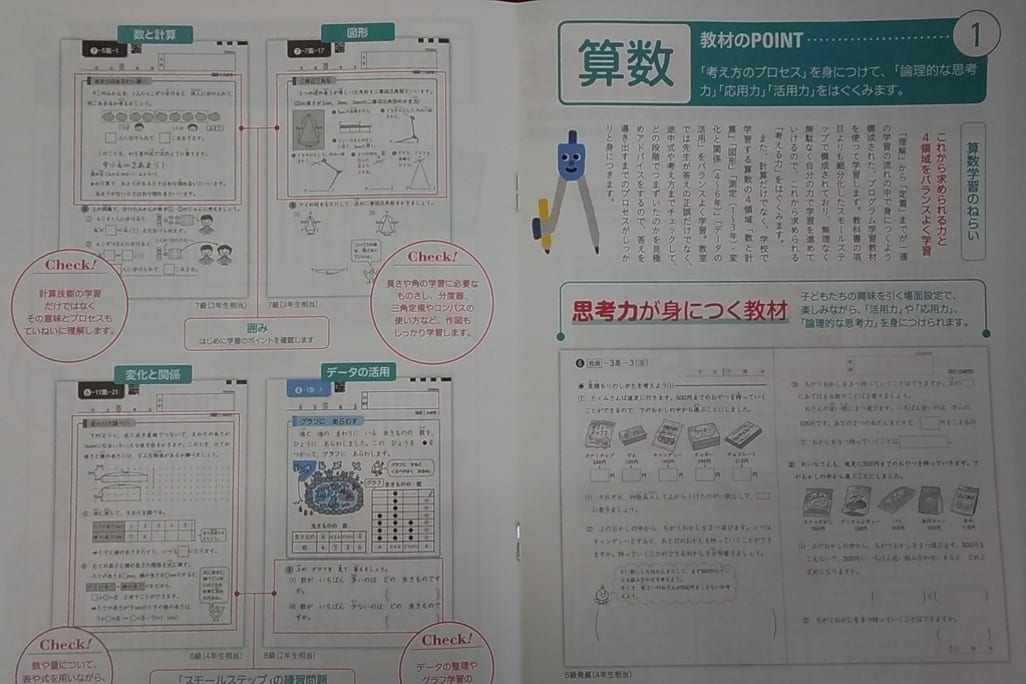 算数・国語の2教科同時並行学習により、確かな学力と「自分で考える力」の基礎をはぐくみます。また、2020年度より小学校の正式な教科となる英語も、しっかり学ぶことができます。子どもたちが学ぶことを「楽しい!」と実感しながら、自学自習の力を養う教材です。