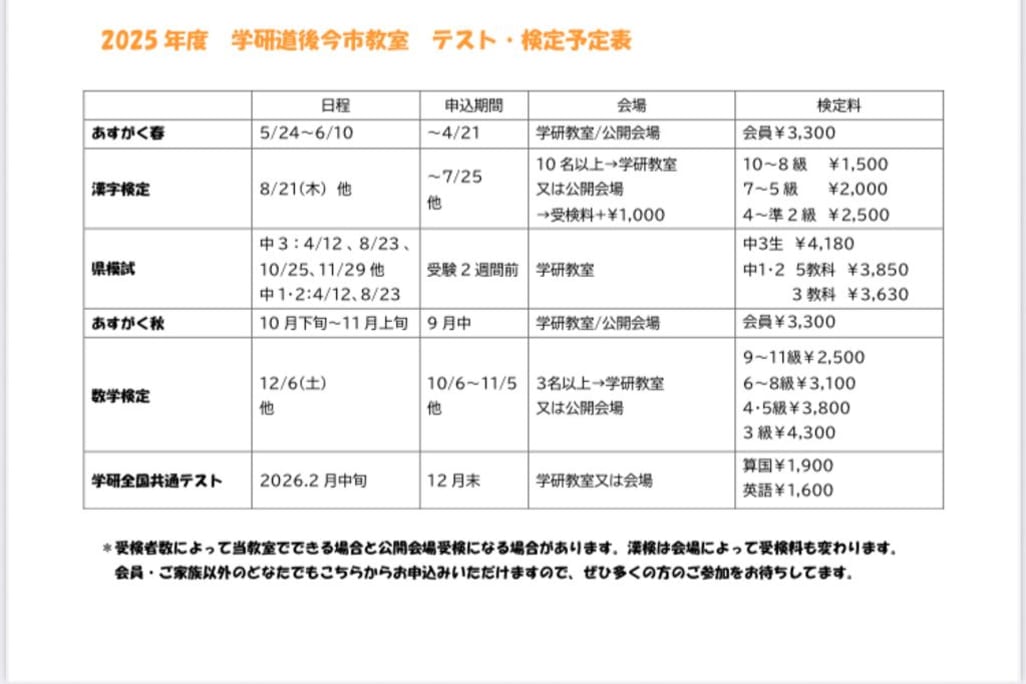 秋の無料体験学習受付中 入学準備学習をお考えの幼児さん、塾をお探しの小学生さん、ぜひ学研教室の無料体験学習にお越しください。 診断テストの結果から、今始める学習と今後の目標について、一人ひとりに合った学びの提案と習得をしっかりサポート致します。 まずはお気軽に体験にお申込みください。 当教室は続けて通っていただけるよう、お子さんの体調不良や急な事情に対応し、希望日に振替を受け付けています。 また、学習意欲の向上に漢検・数検の準会場として小学生から検定合格にも取り組んでいます。会員でない方も当教室を会場として受検できますので、お近くの方、興味のある方はお問い合わせください。 |
